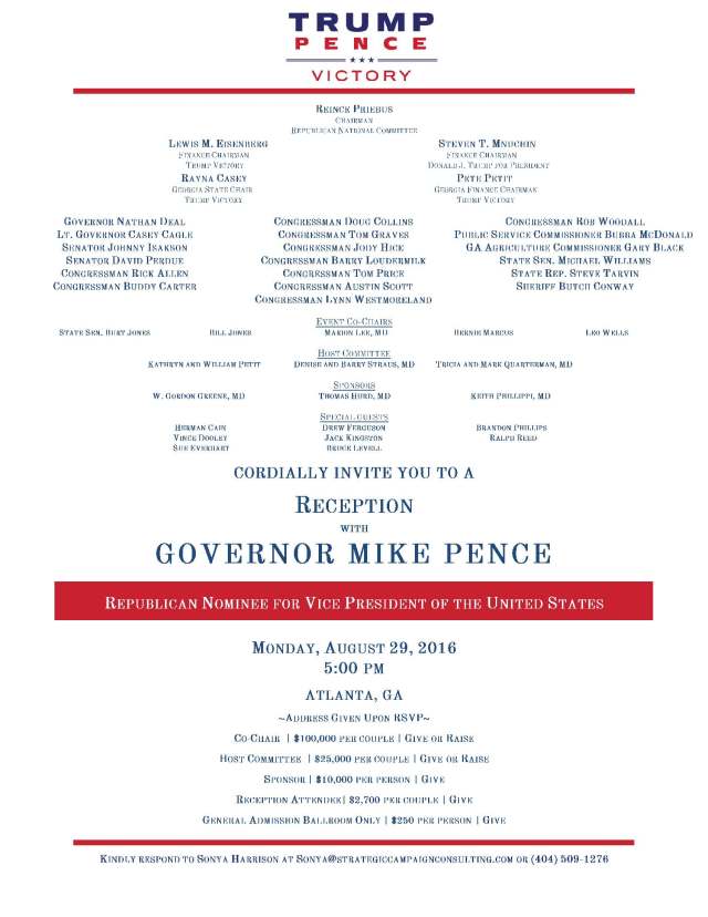 -The Atlanta Journal-Constitution reported Gov. Pence was to do a fundraiser in Atlanta (Buckhead), GA. ($)