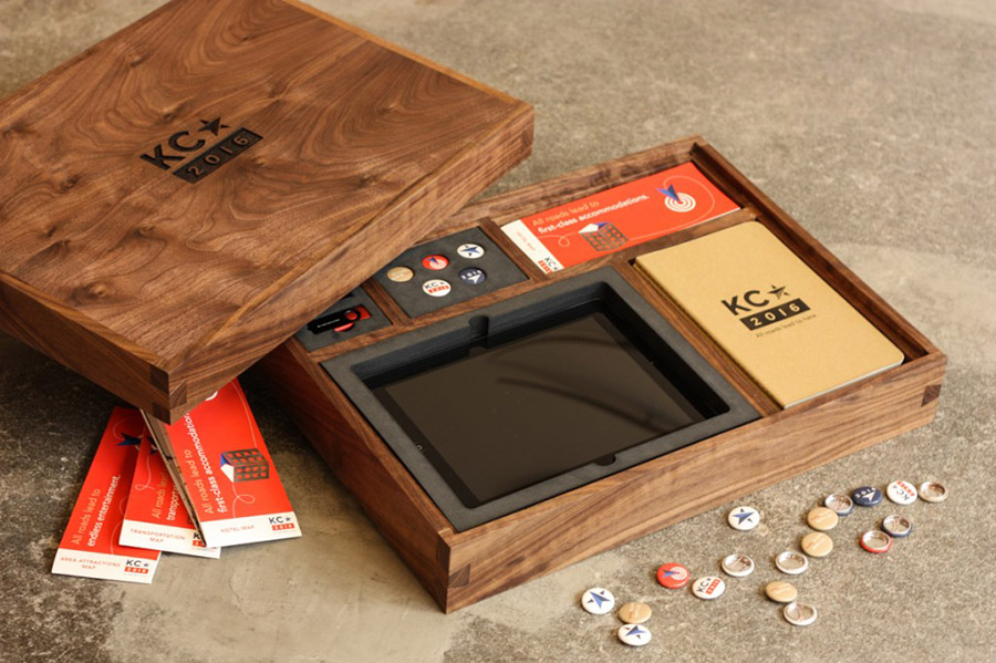 "KC2016 delivered our bid in a hand crafted walnut box engraved with our logo. Inside the box was an iPad with an electronic version of our bid, along with photo albums of of Kansas City and all of the renderings and maps from the bid, it included campaign buttons, three Kansas City maps (Area Attractions, Hotels, Transportation) and moleskin notebooks, one of which included handwritten notes from Kansas City area elected, civic and community leaders expressing their personal thoughts on the opportunity to host the RNC in 2016. Several of those handwritten notes were from individuals who were at the convention in 1976, including Mayor Dick Berkeley and Senator Kit Bond. We also provided hard copies of our rfp, which was near 450 pages." |