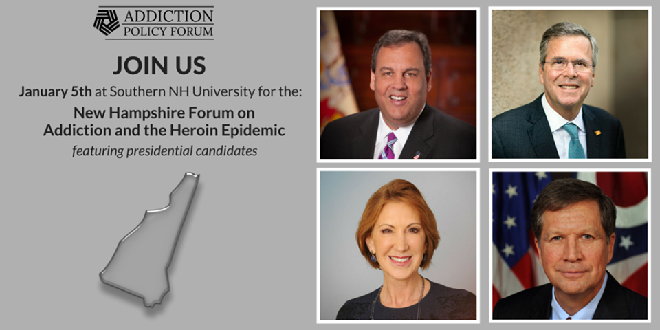 On January 5, 2016, The Addiction Policy Forum is sponsoring the “New Hampshire Forum on Addiction and the Heroin Epidemic” to provide New Hampshire policymakers and major presidential candidates with a venue to discuss addiction, including the heroin and prescription drug epidemic. Our New Hampshire members, partners and practitioners from the prevention, treatment and recovery fields will make up the attendees of the event.