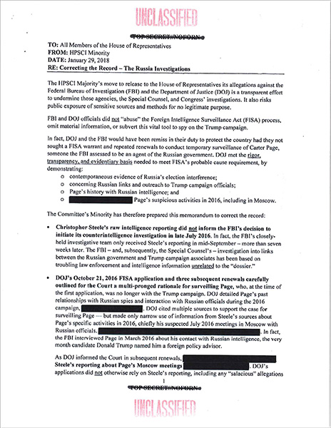 "The document that we are releasing today is the product of a good faith negotiation between the Minority and the FBI and DOJ. But it is unfortunate that the weekend release of the Democratic memo by the White House was delayed beyond what was necessary and to the advantage of those seeking to mislead the American public. From the beginning, the HPSCI Minority expressed its support for any limited redactions to protect sources and methods, as well as sensitive ongoing investigative equities, and these redactions were agreed to at the expert level over a week ago.