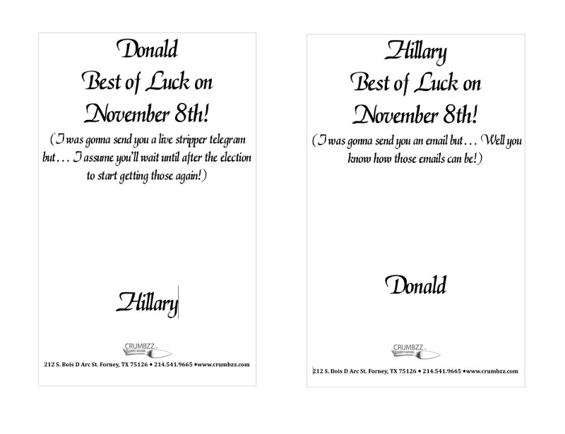 And that brings us to Hillary and Donald who get their Diplomacy Cakes this week. It may not get results, but we're sure the candidates will chuckle at the cards that Sadler included.