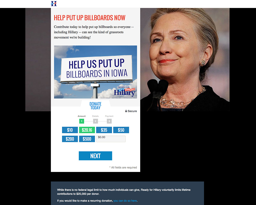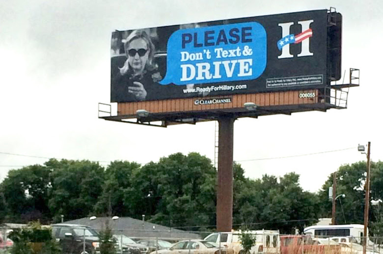 Sept. 13, 2014 - Ready for Hillary put up this billboard in Des Moines on Fleur Drive adjacent to the airport in conjunction with Hillary and Bill Clinton's much anticipated appearance at the Iowa Steak Fry on Sept. 14. Ready for Hillary included the above photo in a fundraising email: [Name], check it out --