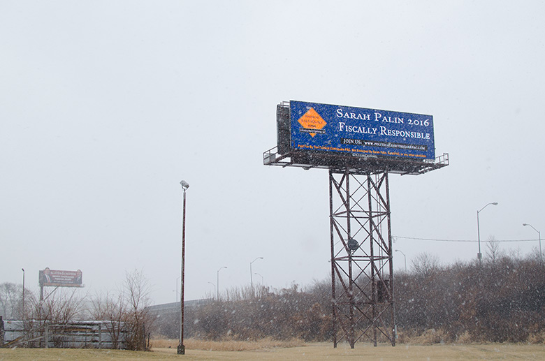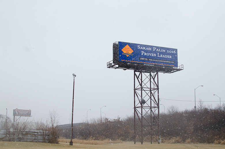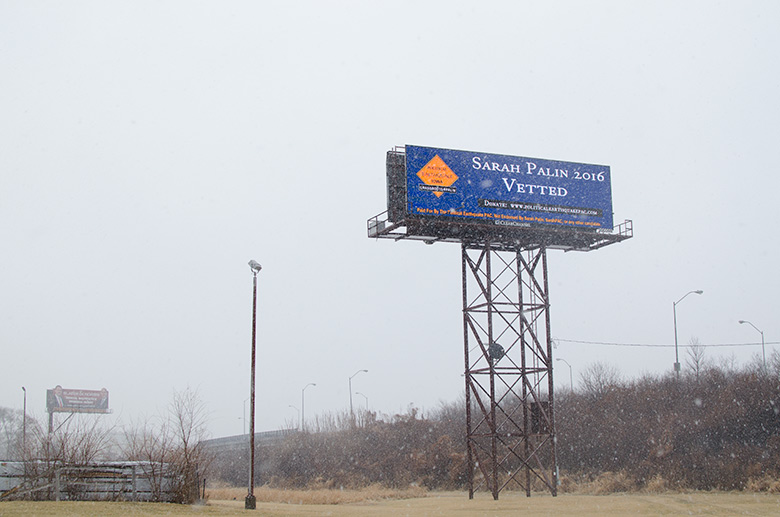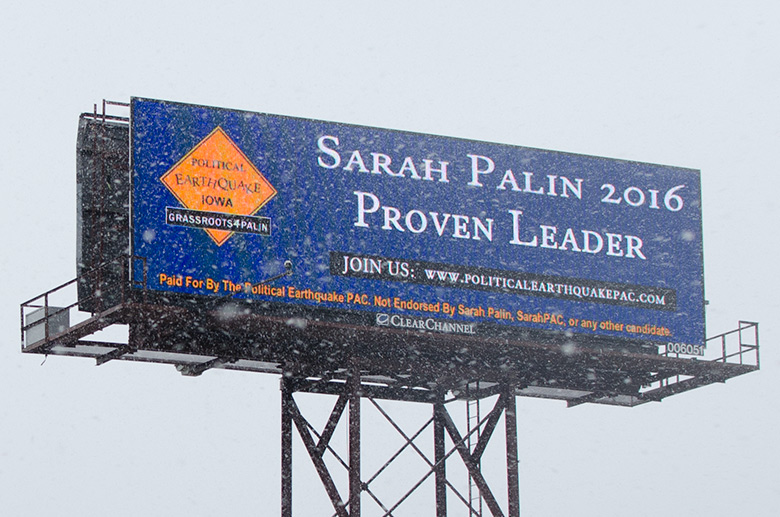 January 25, 2015 - In conjunction with the Iowa Freedom Summit, Political Earthquake PAC, a pro-Sarah Palin super PAC (+), ran three message on this digital billboard on Fleur Drive on the way into Des Moines from the airport. | |||