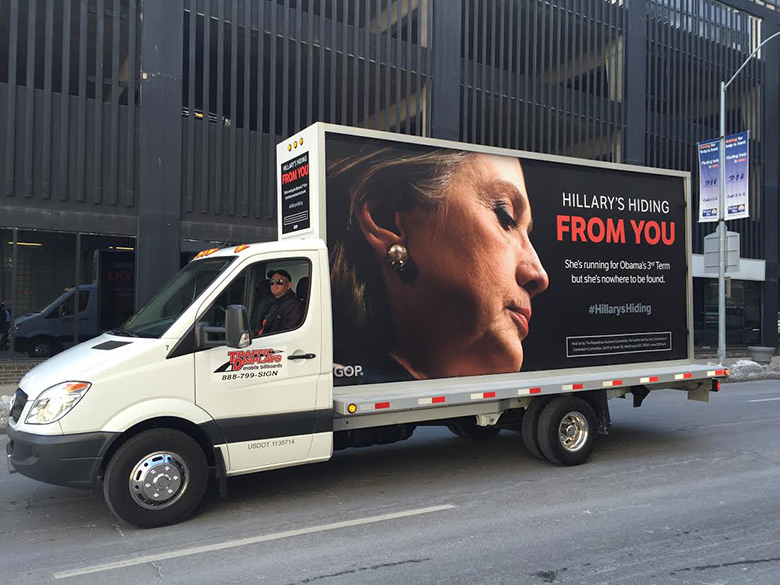 | February 12, 2015 - The Republican National Committee commented on likely Democratic nominee Hillary Clinton's low profile with this mobile billboard in Des Moines, Iowa. [see also: related memo] |