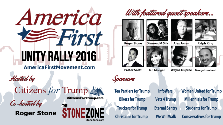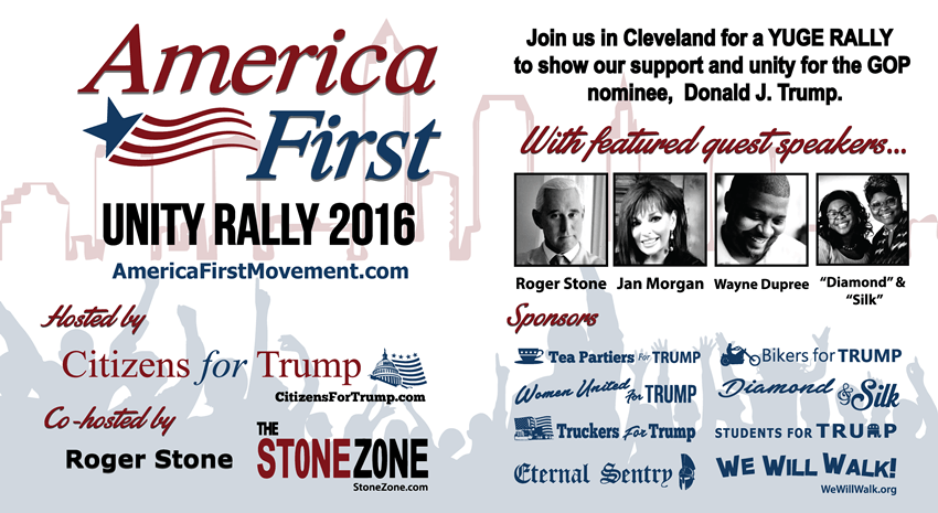 The America First Unity Rally will feature guest speakers Roger Stone who is renowned as a veteran Republican strategist, Jan Morgan who is well known as a national spokesperson on FOX news that advocates for Second Amendment Rights, Wayne Dupree of Conservative Radio fame, Diamond & Silk who have become thrust into the spotlight as strong Trump advocates on their viral YouTube Channel. Following the rally there will be a march from Voinovich Bicentennial Park to the Quicken Loans Arena in downtown Cleveland to show our solidarity for Donald J. Trump.