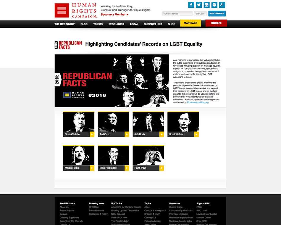 The second phase of the project will cover the positions of potential Democratic candidates on LGBT issues. As a resource to journalists, HRC’s website hrc.org/2016RepublicanFacts highlights the public statements of candidates on key issues, including:
