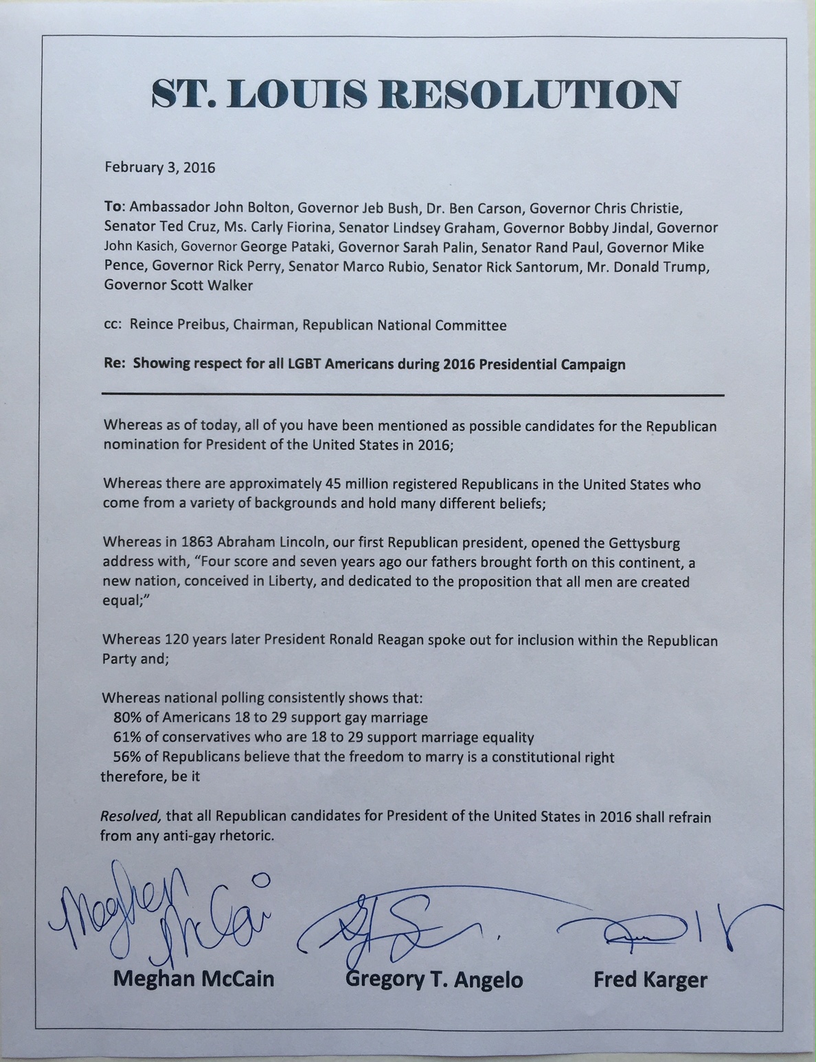 Political columnist and television host Meghan McCain, Log Cabin Republican Executive Director, Gregory T. Angelo and the first openly gay candidate to run for President, Fred Karger all signed the Resolution.