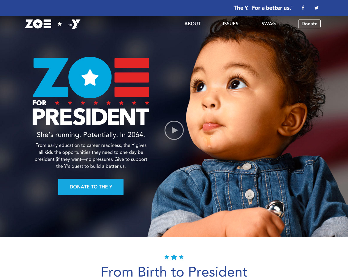 Like all candidates, Zoe has her own campaign website, ZoeForPresident.net, where users can donate to her campaign, watch videos of her stance on issues and shop for swag. When users donate to Zoe's campaign, they are donating to their local Y and supporting the programs and services that enable kids like Zoe to thrive from childhood to old age.