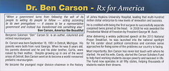 and inside panels. 3 1/2" x 8 5/16."Dr. Ben CarsonHe will heal.He will unite. He will lead. Dr. Ben Carson - Rx for America"When a government turns from following the will of its people to willing its people to follow - acting according to its own prerogatives - it ceases to be a representative government and instead has transformed into something else."Ben Carson, America the Beautiful Benjamin Solomon "Ben" Carson Sr. is an author, columnist and retired neurosurgeon. Dr. Carson was born September 18, 1951 in Detroit, Michigan. His parents were both from rural Georgia. When he was 8 years old, his parents divorced and he and his older brother, Curtis, were raised by their mother. Despite growing up in one of the worst areas of Detroit, Ben Carson went on to become a world-renowned pediatric neurosurgeon. He became the youngest major division chairman in the history of Johns Hopkins University Hospital, leading that multi-hundred million dollar enterprise to new levels of innovation and success. He is credited with being the first surgeon to successfully separate conjoined twins joined at the head. In 2008 he was awarded the Presidential Medal of Freedom by President George W. Bush. After delivering a widely publicized speech at the 2013 National Prayer Breakfast, he was launched into the national spotlight for his candor about political correctness and common sense approaches for fixing some of the problems our country is facing. Most importantly, Ben Carson has never lost touch with where he started. He and his wife, Candy, started the Carson Scholars Fund to help hard working students escape poverty and succeed in life. The Fund now operates in all fifty states, helping thousands of students realize their dreams. _________________