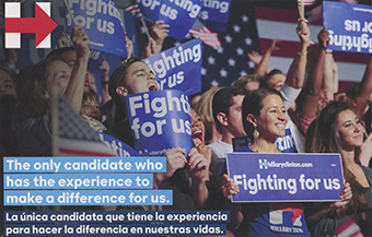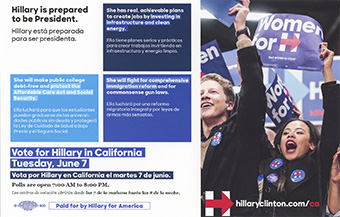 The only candidate who has the experience to make a real difference for us.La única candidata que tiene la experiencia para hacer la diferencia en nuestras vidas.Hillary is prepared to be President. Hillary está preparado para ser presidenta. She has real, achievable plans to create jobs by investing in infrastructure and clean energy. Ella tiene planes serios y prácticos para crear trabajos invirtiendo en infrastructura y energía limpia. She will make public college debt-free and protect the Affordable Care Act and Social Security. Ella luchará para que los estudiantes puedan graduarse de las universidades públicas sin deuda y protegerá la Ley de Cuidado de Salud a Bajo Precio y el Seguro Social. She will fight for comprehensive immigration reform and commonsense gun laws. Ella luchará por una reforma migratoria integral y por leyes de armas más sensatas. Vote for Hillary in California Tuesday, June 7 Vota por Hillary en California el martes 7 de junio. Polls are open 7:00 AM - 8:00 PM Los centros de votación abrirán desde las 7 de la mañana hasta las 8 de la noche. Paid for by Hillary for America [union bug] |