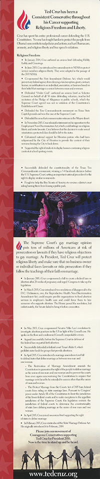Ted Cruz has been a Consistent Conservative throughout his Career supporting Religious Freedom and Liberty.Cruz has spent his entire professional career defending the U.S. Constitution. No one has fought harder to protect the people from Obama' s unconstitutional policies and actions, such as Obamacare, amnesty, and religious liberty and free speech violations.Religious Freedom: • In January 2014, Cruz authored an amicus brief defending Hobby Lobby and Conestoga. • In June 2013, Cruz introduced two amendments to NDAA to protect service members religious liberty. They were adopted in the passage of the 2013 NDAA • Co-sponsored the First Amendment Defense Act, which would prevent any federal agency from denying a tax exemption, grant, contract, license, or certification to an individual, association, or business based on their belief that marriage is a union between a man and a woman. • Defended "Under God": authored an amicus brief as Solicitor General on behalf of all 50 states defending voluntary, teacher-led recitation of the Pledge of Allegiance in public schools, which the Supreme Court agreed was not in violation of the Constitution's Establishment Clause. • Defended the Ten Commandments monument on Texas State Capitol grounds and won the case at the Supreme Court. • Defended the cross that commemorates veterans in the Mojave desert. • In November 2013, Cruz released a statement on his opposition to the Employment Non-Discrimination Act, which could infringe on religious liberty and invite lawsuits. Cruz believes that the decision to make sexual orientation a protected class should be left to the states. • Galvanized national support for Houston pastors who had been subpoenaed by the City of Houston to provide the content of their sermons forcing the City to back down. • Supported the right of students to display banners containing religious content at school sporting events. • Successfully defended the constitutionality of the Texas Ten Commandments monument, winning a 5-4 landmark decision before the U.S. Supreme Court, setting an important national precedent for the right to display similar monuments. • Fought to help the Boy Scouts of America to reverse a district court ruling barring them from leasing a public park. The Supreme Court's gay marriage opinion puts tens of millions of Americans at risk of prosecution or lawsuits if they have religious objections to gay marriage. As President, Ted Cruz will protect religious liberty and make sure that no business owner or individual faces lawsuits or risks prosecution if they follow the teachings of their faith on marriage. • In January 2015, Cruz co-sponsored a bill to create a federal ban on abortion after 20 weeks of pregnancy and urged Congress to take up the legislation. • In March 2015, Cruz introduced two resolutions of disapproval to the D.C. Ordinances, one, the Reproductive Health Non-Discrimination Amendment Act, could require pro-life organizations to fund abortion services in employee's health care and could force them to hire someone who supports abortion. The House passed the resolution, but unfortunately, the Senate failed to bring it before committee. • In May 2013, Cruz co-sponsored Senator Mike Lee's resolution to investigate abortion practices in the US in light of the Gosnell case. He spoke on the floor and condemned Gosnell's unspeakable crimes. • Argued (successfully) before the Supreme Court in defense of the federal ban on partial-birth abortion. • Successfully defended in federal court Texas's Rider 8, which prohibits state funds for groups that provide abortions. • In April 2015, Cruz introduced a marriage amendment and bill to defend states that define marriage as between one man and one woman.
