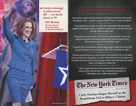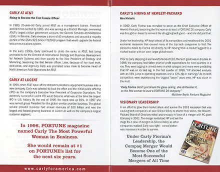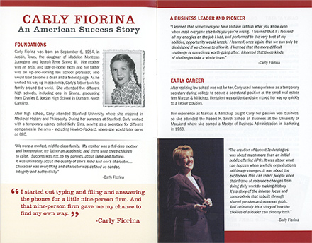 Winston-Salem Journal Carly Fiorina, a woman of accomplishment "There's a bit of Margaret Thatcher in her" Fiorina is impressive...[w]atch her in the upcoming presidential debates and see if you don't notice a little Margaret Thatcher in her. Like Thatcher, Fiorina is tough and smart. By Cal Thomas April 9, 2015 The Washington Post Why Fiorina Connects Tough, reasoned and practical. Moreover, she does not talk in abstract theory or try to convince you that hers is the most conservative position. She just says succinctly what she intends to do and why. Perhaps she will help the party redefine what an "outsider" can be and why we need leaders who don't necessarily have pollitical backgrounds, but who are nevertheless accomplished... By Jennifer Rubin, May 8, 2015 CARLY FIORINAAn American Success StoryFOUNDATIONSCarly Fiorina was born on September 6, 1954, in Austin, Texas, the daughter of Madelon Montross Jueregens and Joseph Tyree Sneed Ill. Her mother was an artist and stay-at-home mom and her father was an up-and-coming law school professor, who would later become a dean and a federal judge. As he worked his way up in academia, Carly's father took his family around the world. She attended five different high schools, including one in Ghana, graduating from Charles E. Jordan High School in Durham, North Carolina. After high school, Carly attended Stanford University, where she majored in Medieval History and Philosophy. During her summers at Stanford, Carly worked with a temporary agency called Kelly Girls, serving as a secretary for different companies in the area - including Hewlett-Packard, where she would later serve as CEO. "We were a modest, middle-class family. My mother was a full-time mother and homemaker, my father an academic, and there were three children to raise. Success was not, to my parents, about fame and fortune. It was ultimately about the quality of one's mind and one's character ....Character was everything and character was defined as candor, integrity and authenticity." -Carly Fiorina "I started out typing and filing and answering the phones for a little nine-person firm. And that nine-person firm gave me my chance to find my own way." -Carly Fiorina A BUSINESS LEADER AND PIONEER "I learned that sometimes you have to have faith in what you know even when most everyone else tells you you're wrong. I learned that if I focused all my energies on the job I had, and performed to the very best of my abilities, opportunity would knock. I learned, once again, that we can only be diminished if we choose to allow it. I learned that the more difficult challenge is sometimes worth going after. I learned that those kinds of challenges take a whole team." -Carly Fiorina EARLY CAREER After realizing law school was not for her, Carly used her experience as a temporary secretary during college to secure a secretarial position at the small real estate firm Marcus & Millichap. Her talent was evident and she moved her way up quickly to a broker position. Her experience at Marcus & Millichap taught Carly her passion was business, so she attended the Robert H. Smith School of Business at the University of Maryland where she earned a Master of Business Administration in Marketing in 1980. "The creation of Lucent Technologies was about much more than an initial public offering (/PO). It was about what can happen when a whole organization's self-image changes. It was about the excitement that can infect people when their frame of reference changes from doing daily work to making history. It's a story of the intense focus and camaraderie that is built through shared passion and common goals. And ultimately it's a story of how the choices of a leader can destroy both." -Carly Fiorina CARLY AT AT&T Rising to Become the First Female Officer In 1980, 25-year-old Carly joined AT&T as a management trainee. Promoted several times so that by 1985, she was serving as a District Manager, overseeing AT& T's largest civilian government account, the General Services Administration (GSA). In this role, Carly oversaw a team of 60 employees and secured a majority portion of the GSA's $25 billion FTS2000 program that would upgrade the federal telecommunications system. In the early 1990s, Carly continued to climb the ranks at AT&T, first being promoted to be the Director of International Strategy and Business Development for Network Systems and then quickly to the Vice President of Strategy and Marketing, becoming the first female officer. Later, because of her hard work, dedication, and ingenuity Carly was promoted once more to become Head of North American Field Operations for AT&T. CARLY AT LUCENT In 1995, when AT&T spun off its telecommunications equipment business into a new company, Carly was selected to lead the effort and the initial public offering (IPO) as the company's Executive Vice President of Corporate Operations. The extremely successful Lucent IPO would become what was at the time the largest IPO in U.S. history. By the end of 1996, the stock was up 92%. In 1997 she was named group President for the global service provider business. The global service provider business had annual revenues of $20 billion and was the largest and fastest-growing business at Lucent as well as the company's largest customer segment. In 1998, FORTUNE magazine named Carly The Most Powerful Woman in Business. She would remain at # 1 on FORTUNE's list for the next six years. CARLY'S HIRING AT HEWLETT-PACKARD Was Historic In 1999, Carly Fiorina was recruited to serve as the Chief Executive Officer of Hewlett-Packard, becoming the first woman to lead a FORTUNE 20 company. Carly was brought on board to reinvent the struggling tech giant - and she did just that. Under her leadership, HP leapt ahead of its competitors and weathered the 2001 economic recession that caused many of the top tech companies to fold. The decisions made by Fiorina led directly to HP moving from a market laggard to a market leader, with an even 