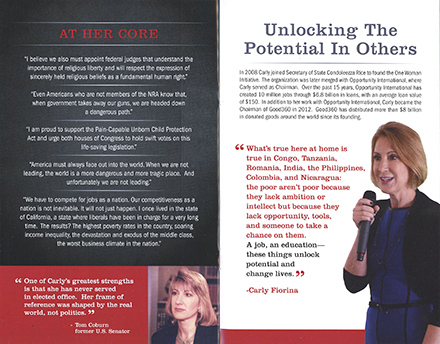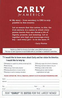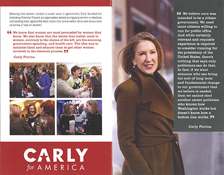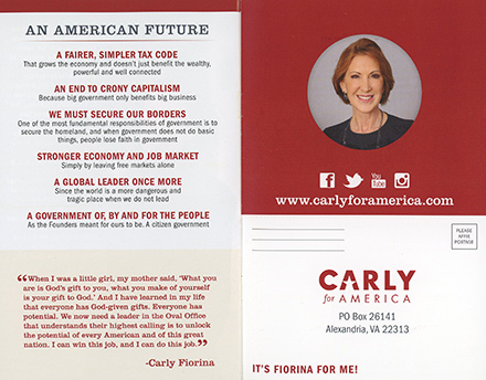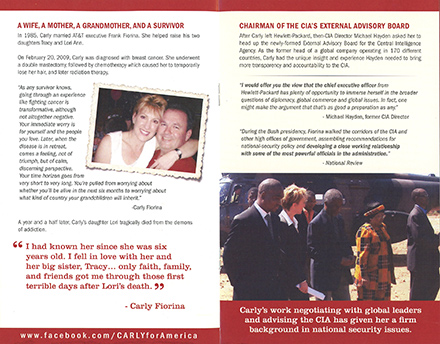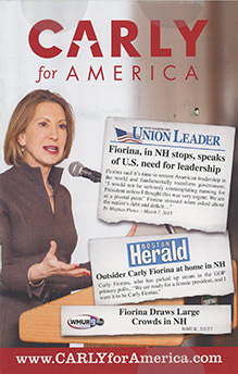 Iowa version: - On the last page "The Blueprint to Take Our Country Back" replaces ""An American Future." - Addresses are Iowa headquarters. New Hampshire version: ![]() - Cover has headlines from New Hampshire/New England news sources: Union Leader Fiorina, in NH stops, speaks of U.S. need for leadership Fiorina said it's time to restore American leadership in the world and fundamentally transform government. "I would not be seriously contemplating running for president unless I thought this was very urgent. We are at a pivotal point" Fiorina stressed when asked about the nation's debt and deficit..." By Meghan Pierce-March 7, 2015 Boston Herald Outsider Carly Fiorina at home in NH Carly Fiorina, who has picked up steam in the GOP primary polls..."We are ready for a female presidetn, and I want it to be Carly Fiorina." WMUR 9 ABC Fiorina Draws Large Crowds in NH WMUR, 5/1/15 - On the last page "The Blueprint to Take Our Country Back" replaces ""An American Future." - Addresses are New Hampshire headquarters. - On back page in red is "Just Endorsed by Ovide Lamontagne!" [ed. note: that happened Jan. 2, 2016] |