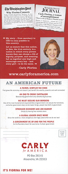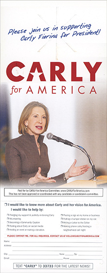 The Washington Post Why Fiorina Connects Tough, reasoned and practical. Moreover, she does not talk in abstract theory or try to convince you that hers is the most conservative position. She just says succinctly what she intends to do and why. Perhaps she will help the party redefine what an "outsider" can be and why we need leaders who don't necessarily have pollitical backgrounds, but who are nevertheless accomplished... By Jennifer Rubin, May 8, 2015 Winston-Salem Journal Carly Fiorina, a woman of accomplishment "There's a bit of Margaret Thatcher in her" Fiorina is impressive...[w]atch her in the upcoming presidential debates and see if you don't notice a little Margaret Thatcher in her. Like Thatcher, Fiorina is tough and smart. By Cal Thomas April 9, 2015 "My story – from secretary to CEO is only possible in this country. Let us ensure that this nation, in this, the 21st century, is a nation in which every person knows they can choose a life of dignity, purpose, and meaning. Let us together aim high and encourage every boy – and every girl – to do the same." - Carly Fiorina www.carlyforamerica.comAN AMERICAN FUTUREA FAIRER, SIMPLER TAX CODEThat grows the economy and doesn't just benefit the wealthy, powerful and well connected AN END TO CRONY CAPITALISM Because big government only benefits big business WE MUST SECURE OUR BORDERS One of the most fundamental responsibilities of government is to secure the homeland, and when government does not do basic things, people lose faith in government STRONGER ECONOMY AND JOB MARKET Simply by leaving free markets alone A GLOBAL LEADER ONCE MORE Since the world is a more dangerous and tragic place when we do not lead A GOVERNMENT OF, BY AND FOR THE PEOPLE As the Founders meant for ours to be. A citizen government Paid for by CARLY for America Committee. www.CARLYForAmerica.com Thiis has not been approved or coordinated with any candidate or candidate's committee. |