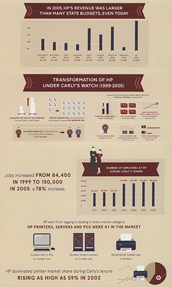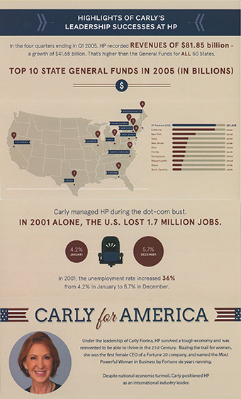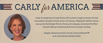 CARLY for AMERICAUnder the leadership of Carly Fiorina, HP survived a tough economy and was reinvented to be able to thrive in the 21st Century. Blazing the trail for women, she was the first female CEO of a Fortune 20 company, and named the Most Poweful Woman in Business by Fortune six years running.Despite national economic turmoil, Carly positioned HP as an international industry leader. HIGHLIGHTS OF CARLY'S LEADERSHIP SUCCESSES AT HPIn the four quarters ending in Q1 2005, HP recorded REVENUES OF $81.85 billion - a growth of $40.68 billion. That's higher than the General Funds for ALL 50 States.Carly managed HP during the dot-com bust. IN 2001 ALONE, THE U.S. LOST 1.7 MILLION JOBS. IN 2005, HP''S REVENUE WAS LARGER THAN MANY STATE BUDGETS, EVEN TODAY