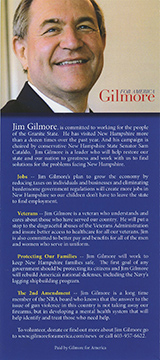 Jim Gilmore, is committed to working for the people of the Granite State. He has visited New Hampshire more than a dozen times over the past year. And his campaign is chaired by conservative New Hampshire State Senator Sam Cataldo. Jim Gilmore is a leader who will help restore our state and our nation to greatness and work with us to find solutions for the problems facing New Hampshire. Jobs -- Jim Gilmore's plan to grow the economy by reducing taxes on individuals and businesses and eliminating burdensome government regulations will create more jobs in New Hampshire so our children don't have to leave the state to find employment. Veterans -- Jim Gilmore is a veteran who understands and cares about those who have served our country. He will put a stop to the disgraceful abuses of the Veterans Administration and insure better access to healthcare for all our veterans. Jim is also committed to better pay and benefits for all of the men and women who serve in uniform. Protecting Our Families -- Jim Gilmore will work to keep New Hampshire families safe. TI1e first goal of any government should be protecting its citizens and Jim Gilmore will rebuild America's national defenses, including the Navy's lagging shipbuilding program. The 2nd Amendment -- Jim Gilmore is a long time member of the NRA board who knows that the answer to the issue of gun violence in this country is not taking away our firearms, but in developing a mental health system that will help identify and treat those who need help. To volunteer, donate or find out more about Jim Gilmore go to www.gilmoreforamerica.com/news or call 603-957-6622. Paid by Gilmore for America |