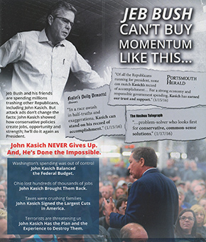 AMERICA NEVER GIVES UP.VOTE JOHN KASICH for PRESIDENTJeb Bush and his friends are spending millions trashing other Republicans, including John Kasich. But attack ads don't change the facts: John Kasich showed how conservative policies create jobs, opportunity and strength: he'll do it again as President. JEB BUSH CAN"T BUY MOMENTUM LIKE THIS...Portsmouth Herald "Of all the Republicans running for president, none can match Kasich's record of accomplishment... For a strong economy and responsible government spending, Kasich has earned our trust and support." (1/15/16)Foster's Daily Democrat (Dover) "In a race awash in half-truths and exaggerations, Kasich can stand on his record of accomplishment." (1/15/16) The Nashua Telegraph "...problem-solver who looks first for conservative, common-sense solutions." (1/17/16) John Kasich NEVER Gives Up. And, He's Done the Impossible.Washington's spending was out of controlJohn Kasich Balanced the Federal Budget. Ohio lost hundreds of thousands of jobs John Kasich Brought Them Back. Taxes were crushing families John Kasich Signed the Largest Cuts in America. Terrorists are threatening us John Kasich Has the Plan and the Experience to Destroy Them. VOTE JOHN KASICH FOR PRESIDENT ON FEBRUARY 9TH!JohnKasich.com/NewHampshireFor information abour your polling location, call our New Hampshire Headquarter at 603-232## or emailus at NH@JohnKasich.com |