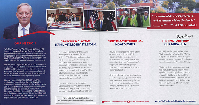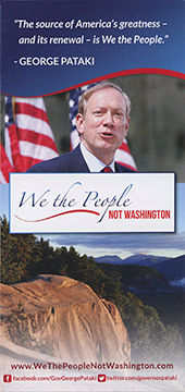 "We The People, Not Washington” is a Super PAC formed to support Governor Pataki’s agenda to empower the citizens of our great nation, dismantle the perpetual growth and overreach of the federal government, end the Washington insider game and begin reducing the size of the federal government. We are promoting Governor Pataki’sideas because we cannot lose the debate in this election as we did in 2008 and 2012. America should have leaders with records of accomplishment, who are focused on the issues that matter and who have won tough elections despite challenging demographics. We are a grassroots effort to finally give We the People a