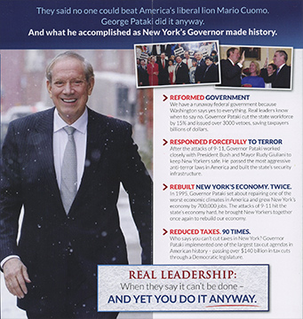 George Pataki did it anyway. And what he accomplished as New York's Governor made history. REFORMED GOVERNMENT We have a runaway federal government because Washington says yes to everything. Real leaders know when to say no. Governor Pataki cut the state workforce by 15% and issued over 3000 vetoes, saving taxpayers billions of dollars. After the attacks of 9-11, Governor Pataki worked closely with President Bush and Mayor Rudy Giuliani to keep New Yorkers safe. He passed the most aggressive anti-terror laws in America and built the state's security infrastructure. REBUILT NEW YORK’S ECONOMY. TWICE. In 1995, Governor Pataki set about repairing one of the worst economic climates in America and grew New York’s economy by 700,000 jobs. The attacks of 9-11 hit the state s economy hard, he brought New Yorkers together once again to rebuild our economy. REDUCED TAXES. 90 TIMES. Who says you can't cut taxes in New York? Governor