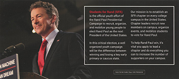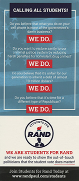 Students for Rand (SFP) is the official youth effort of the Rand Paul Presidential Campaign to recruit, organize, and mobilize young people to elect Rand Paul as the next President of the United States. In this critical election, a well organized youth campaign will be the difference between winning and losing a key early primary or caucus state. Our mission is to establish an SFR chapter on every college campus in the United States. Chapter leaders recruit new members on campus, organize events, and mobilize students to vote for Rand Paul. To help Rand Paul win, it's vital you apply to lead a chapter and do everything you can to increase the number of supporters on your campus. CALLING ALL STUDENTS!Do you believe that what you do on your cell phone is none of the government's damn business?WE DO.Do you want to restore sanity to our criminal justice system by reducing harsh penalties for nonviolent drug crimes?WE DO.Do you believe that it's unfair for our generation to inherit a debt of almost 19 trillion dollars?WE DO.Do you believe that it's time for a different type of Republican?WE DO.WE ARE STUDENTS FOR RAND and we are ready to show the out-of-touch politicians that the student vote does matter! Join Students for Rand Today at www.randpaul.com/students |