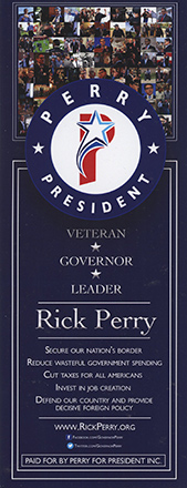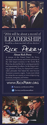 VETERAN GOVERNOR LEADER Rick PerrySECURE OUR NATION'S BORDERREDUCE WASTEFUL GOVERNMENT SPENDING CUT TAXES FOR ALL AMERICANS INVEST IN JOB CREATION DEFEND OUR COUNTRY AND PROVIDE DECISIVE FOREIGN POLICY www.RickPerry.org Facebook.com/GovernorPerry Twitter.com/GovernorPerry "2016 will be about a record of LEADERSHIP.It will be a show me don't tell me election."About Rick PerryA veteran of the United States Air Force, dry-land-cotton farmer, and former governor of the 12th largest economy in the world, Rick Perry has devoted his life to creating prosperity and opportunity for others. As the longest serving governor of Texas, he championed conservative principles that helped his state become America's economic engine. Learn more about his vision for our country at www.rickperry.org, facebook, instagram, and twitter.www.RickPerry.orgFacebook.com/GovernorPerry Twitter.com/GovernorPerry |