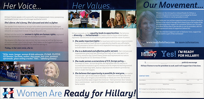 Her Values... Hillary reminds us that equality leads to opportunities. She believes in diversity and inclusiveness for leaders and for those whom leaders represent. She believes in full political participation and the cause of justice. > She seeks important fights for equal pay and economic empowerment, family and medical leave, access to reproductive health care, affordable health insurance, better schools with expanded learning options, and safe and affordable child care. > She is a dedicated and effective public servant. She's led national organizations, practiced law, served as first lady of her state and of our country, served in the United States Senate and represented our nation across the globe as U.S. Secretary of State. > She made women a cornerstone of U.S. foreign policy as Secretary of State. Across the globe, she explained that for nations to succeed and economies to grow, women must be respected and empowered and at the leadership table. And as a diplomat she worked to provide the tools to make that happen. > She believes that opportunity is possible for everyone, no matter who you are – girl or boy, man or woman – where you were born, the color of your skin, your religion, your ethnicity or whom you love. She believes we must hold the same respect for everyone – their potential, their talents, their contributions – and we will achieve a stronger, smarter America and a better world. Our Movement... Women are the driving force behind Ready for Hillary, a nationwide grassroots movement encouraging the former Secretary of State to run for president in 2016. Now, with over two million supporters and 50,000 donors, Ready for Hillary is the vehicle through which Americans of all walks of life are expressing their support for a potential Hillary run. Our goal is to show Hillary that if she decides to run for president, she will have a grassroots army of supporters behind her. Sign the attached supporter card to lend your voice, support her values and be a party of this movement! Visit www.readyforhillary.com for more information. Women Are Ready
