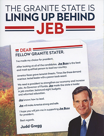 THE GRANITE STATE IS LINING UP BEHIND JEBDEAR FELLOW GRANITE STATER,I've made my choice for president. After looking at all of the candidates, JEB BUSH is the best and most qualified person to lead our country. America faces grave terrorist threats. Times like these demand a serious, tested leader with a proven track record. We need a president to strengthen our economy and increase jobs. As Governor of Florida, JEB made the state a leader in job creation, balanced eight budgets, and reformed education. JEB knows how to lead. JEB will make America strong and safe. I hope you will join me in supporting JEB BUSH for president. Best Regards, Judd Gregg |