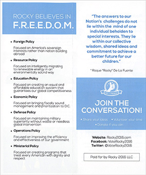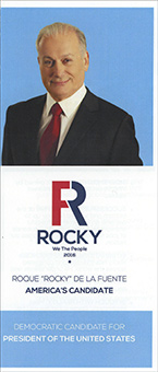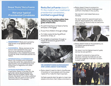 ROCKYWe The People2016 ROQUE "ROCKY" DE LA FUENTE AMERICA'S CANDIDATE DEMOCRATIC CANDIDATE FOR PRESIDENT OF THE UNITED STATES Roque "Rocky" De La Fuente Democratic Presidential Candidate Not your typical Presidential Candidate• INDEPENDENT: Rocky isn't owned by Wall Street or by special interest lobbies.• SUCCESSFUL : Rocky started ot the bottom and worked his way up to become an extremely successful entrepreneur who created thousands of jobs for other Americans across our Nation. • INTERNATIONALLY EXPERIENCED: Rocky has traveled and competed across the world. He understands and appreciates cultural differences and knows how to negotiate with other countries. • IN TOUCH WITH REALITY: Most importantly. Rocky is just like you. He genuinely cares about people and takes the time to listen rather than lecture. He doesn't try to be o polished politician. He just wants to be a great representative of the people. Rocky De La Fuente doesn't fit the mold of our traditional presidential candidates ... and that's a good thing! Rocky has held real jobs rather than political ones. He doesn't have to guess what it's like: • To work long hours to feed a family and pay a mortgage • To put five children through college • To make a payroll during difficult economic times, or • To navigate a business through a maze ol excessive government regulations. HE UNDERSTANDS OUR ECONOMY AND CARES ABOUT OUR NEEDS. • Rocky doesn't need to ride in chauffeured limousines or have people and the press roped off to make him feel important. He feels special when he gets to meet new people and share their hopes and dreams. • Rocky doesn't have to pretend to understand the unique challenges that confront minorities in this country. He was born and raised here as a minority. He never asked for special treatment. .. only for equal opportunity. And when it didn't exist he found a way to overcome those barriers. • Rocky doesnt look at the presidency as his highest personal level of achievement. He views it as the highest level of public service he can perform. He doesn't pretend to have all the solutions. Instead, he believes we can find them together if we learn to listen to each other. ROCKY BELIEVES IN F.R.E.E.D.O.M.• Foreign PolicyFocused on America's sovereign interests rather than nation building abroad • Resource Policy Focused on intelligently migrating to renewable energy In an environmentally sound way • Education Policy Focused on creating an equal and affordable education system that guarantees our global competitiveness • Economic Policy Focused on bringing fiscally sound management and prioritization to D.C. • Defense Policy Focused on maintaining military superiority without waste or needless global intervention • Operations Policy Focused on improving the efficiency and effectiveness of our government • Ministerial Policy Focused on creating proqrams that treat every American with dignity and respect "The answers to our Nation's challenges do not lie within the