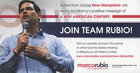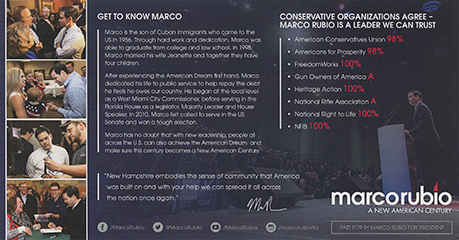 Hampshire are ready for Marco's positive message of A NEW AMERICAN CENTURY.JOIN TEAM RUBIO!Visit our website and join thousands of other Granite Staters making a difference with Marco today.www.marcorubio.com/join/new-hampshire GET TO KNOW MARCOMarco is the son of Cuban immigrants who came to the US in 1956. Through hard work and dedication, Marco was able to graduate from college and law school. In 1998, Marco married his wife Jeanette and together they have four children.After experiencing the American Dream first hand, Marco dedicated his life to public service to help repay the debt he feels he owes our country. He began at the local level as a West Miami City Commissioner, before serving in the Florida House as a legislator, Majority Leader and House Speaker. In 2010, Marco felt called to serve in the US Senate and won a tough election. Marco has no doubt that with new leadership, people all across the U.S. can also achieve the American Dream and make sure this century becomes a New American Century. "New Hampshire embodies the sense of community that America was built on and with your help we can spread it all across the nation once again." [Rubio signature] CONSERVATIVE ORGANIZATIONS AGREE – MARCO RUBIO IS A LEADER WE CAN TRUST• American Conservatives Union 98%• Americans for Prosperity 98% • FreedomWorks 100% • Gun Owners of America A • Heritage Action 100% • National Rifle Association A • National Right to Life 100% • NFIB 100% |