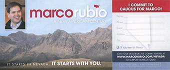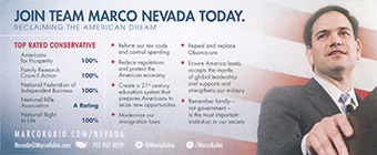 JOIN TEAM MARCO NEVADA TODAY.RECLAIMING THE AMERICAN DREAMTOP-RATED CONSERVATIVEAmericans for Prosperity 100%Family Research Council Action 100% National Federation of Independent Business 100% National Rifle Association A Rating National Right to Life 100% * Reform our tax code and control spending * Reduce regulations and protect the American economy * Create a 21st century education system that prepares Americans to seize new opportunities * Modernize our immigration laws * Repeal and replace Obamacare * Ensure America leads, accepts the mantle of global leadership and supports and strengthens our military * Remember family – not government – is the most important institution in our society www.MARCORUBIO.com/NEVADA |