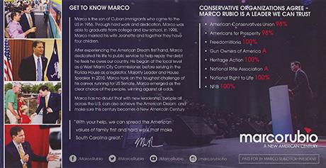 Carolina are ready for Marco's positive message of A NEW AMERICAN CENTURY.JOIN TEAM RUBIO!Visit our website and join thousands of other South Carolina residents making a difference with Marco today.www.marcorubio.com/join/south-carolina GET TO KNOW MARCOMarco is the son of Cuban immigrants who came to the US in 1956. Through hard work and dedication, Marco was able to graduate from college and law school. In 1998, Marco married his wife Jeanette and together they have four children.After experiencing the American Dream first hand, Marco dedicated his life to public service to help repay the debt he feels he owes our country. He began at the local level as a West Miami City Commissioner, before serving in the Florida House as a legislator, Majority Leader and House Speaker. In 2010, Marco took on the toughest challenge of his career, running for US Senate. Marco emerged as the clear choice of the people, winning against all odds. Marco has no doubt that with new leadership, people all across the U.S. can also achieve the American Dream and make sure this century becomes a New American Century. "With your help, we can spread the American values of family first and hard work that make South Carolina great." [Rubio signature] CONSERVATIVE ORGANIZATIONS AGREE – MARCO RUBIO IS A LEADER WE CAN TRUST• American Conservatives Union 98%• Americans for Prosperity 98% • FreedomWorks 100% • Gun Owners of America A • Heritage Action 100% • National Rifle Association A • National Right to Life 100% • NFIB 100% __________ ed. note: Very similar to the New Hampshire card. A bit of revised language in "Get to Know Marco" and four different photos in the strip down the left side. |