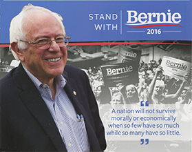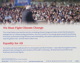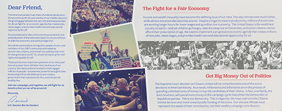 STAND WITH Bernie 2016 "A nation will not survive morally or economically when so few have so much while so many have so little." Dear Friend, The American people must make a fundamental decision. Do we continue the 40-year decline of our middle class and the growing gap between the very rich and everyone else? Or, do we fight for an economic agenda that creates jobs, raises wages, and provides health care and educational opportunity for all? Are we prepared to take on the enormous economic and political power of the billionaire class? Or, do we continue to slide into economic and political oligarchy? Should we stand aside as immigrants, people of color, and members of the LGBT community are treated as second-class citizens, and women are paid less than men for doing the same work? Or, should we stand up for civil rights and equality for all? These are the most important questions of our time, and how we answer them will determine the future of our country. We need a political revolution that engages millions of people-a movement powerful enough to take America back from the billionaires and create a government that represents all of us, and not just the wealthy few. Join our campaign, and together we will fight for an America that we can all be proud of. Sincerely, [Bernie signature] U.S. Senator Bernie Sanders The Fight for a Fair EconomyIncome and wealth inequality have become the defining issue of our time. The very rich become much richer, while almost everyone else becomes poorer. Despite a huge increase in productivity, millions of Americans are working longer hours for lower wages and 45 million live in poverty. The United States is the wealthiest country on earth-and yet children go hungry, veterans sleep out on the streets, and senior citizens cannot afford their prescription drugs. We need to implement a progressive economic agenda that creates millions of new jobs, raises wages, and provides health care and educational opportunity for all.Get Big Money Out of PoliticsThe Supreme Court decision on Citizens United will be remembered as one of the worst decisions in American history. As a result, millionaires and billionaires are in the process of spending unlimited sums of money to buy the candidates of their choice. In fact, one family, the Koch brothers, will spend more money in this campaign cycle than either the Democratic or Republican parties. This is not democracy. This is oligarchy. We must overturn the Citizens United decision and move toward public funding of elections. Our elected officials must represent the needs of their constituents, not their wealthy campaign contributors.We Must Fight Climate ChangeThe United States must lead the world in combating climate change and make certain that this planet is habitable for our children and grandchildren. We must transform our energy system away from polluting fossil fuels, and toward energy efficiency and sustainability. We need to take bold and immediate action to stop this global crisis-and we need to take it now.Equality for AllAs a nation, we must eradicate all forms of prejudice and discrimination-especially those against women, people of color, immigrants, and members of the LGBT community. All Americans are entitled to fair treatment and human dignity.PAID FOR BY BERNIE 2016 (NOT THE BILLIONAIRES) Bernie 2016 - PO Box 905, Burlington, VT 05402- info@berniesanders.com WWW.BERNIE SANDERS.COM [union bug] |