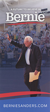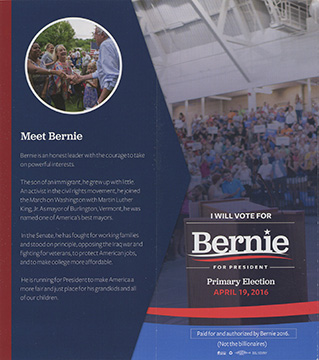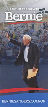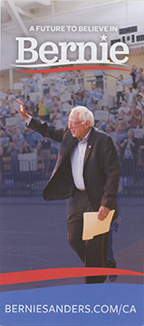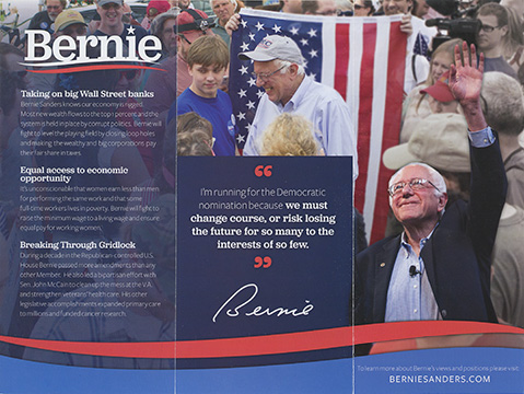 Taking on big Wall Street banks Bernie Sanders knows our economy is rigged. Most new wealth flows to the top 1 percent and the system is held in place by corrupt politics. Bernie will fight to level the playing field by closing loop holes and making the wealthy and big corporations pay their fair share in taxes. Equal access to economic opportunity It's unconscionable that women earn less than men for performing the same work and that some full-time workers lives in poverty. Bernie will fight to raise the minimum wage to a living wage and ensure equal pay for working women. Breaking Through Gridlock During a decade in the Republican-controlled U.S. House, Bernie passed more amendments than any other Member. He also led a bipartisan effort with Sen. John McCain to clean up the mess at the V.A. and strengthen veterans' healthcare. His other legislative accomplishments expanded primary care to millions and funded cancer research. "I'm running for the Democratic nomination because we must change course, or risk losing the future for so many to the interests of so few." Meet BernieBernie is an honest leader with the courage to take on powerful interests.The son of an immigrant, he grew up with little. An activist in the civil rights movement, he joined the March on Washington with Martin Luther King, Jr. As mayor of Burlington, Vermont, he was named one of America's best mayors. In the Senate, he has fought for working families and stood on principle, opposing the Iraq war and fighting for veterans, to protect American jobs, and to make college more affordable. He is running for President to make America a more fair and just place for his grandkids and all of our children. ![]() ![]() ![]() ![]() The three versions of the brochure are nearly identical. The later versions add "OR" or "CA" to the web address, and the date on the back changes. The California version adds "Register to Vote by..." Also in the California version a typo inside is fixed ("...that some full-time workers live in poverty.") Below is an insert included in a brochure from the office in Oakland, CA. ![]() |