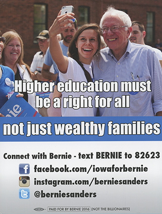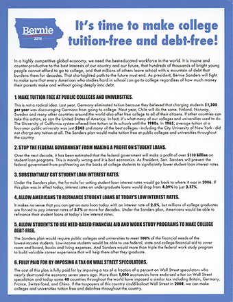 Higher education must be a right for all not just wealthy familiesConnect with Bernie - text BERNIE to 82623facebook.com/iowaforbernieinstagram.com/berniesanders@berniesanders[union bug] PAID FOR BY BERNIE 2016 (NOT THE BILLIONAIRES)It's time to make college tuition-free and debt-free!In a highly competitive global economy, we need the best-educated workforce in the world. It is insane and counter-productive to the best interests of our country and our future, that hundreds of thousands of bright young people cannot afford to go to college, and that millions of others leave school with a mountain of debt that burdens them for decades. That shortsighted path to the future must end. As president, Bernie Sanders will fight to make sure that every American who studies hard in school can go to college regardless of how much money their parents make and without going deeply into debt.1. MAKE TUITION FREE AT PUBLIC COLLEGES AND UNIVERSITIES.This is not a radical idea. Last year, Germany eliminated tuition because they believed that charging students $1,300 per year was discouraging Germans from going to college. Next year, Chile will do the same. Finland, Norway, Sweden and many other countries around the world also offer free college to all of their citizens. If other countries can take this action, so can the United States of America. In fact, it's what many of our colleges and universities used to do. The University of California system offered free tuition at its schools until the 1980s. In 1965, average tuition at a four-year public university was just $243 and many of the best colleges - including the City University of New York - did not charge any tuition at all. The Sanders plan would make tuition free at public colleges and universities throughout the country.2. STOP THE FEDERAL GOVERNMENT FROM MAKING A PROFIT ON STUDENT LOANS.Over the next decade, it has been estimated that the federal government will make a profit of over $110 billion on student loan programs. This is morally wrong and it is bad economics. As President, Sen. Sanders will prevent the federal government from profiteering on the backs of college students to significantly lower student loan interest rates.3. SUBSTANTIALLY CUT STUDENT LOAN INTEREST RATES.Under the Sanders plan, the formula for setting student loan interest rates would go back to where it was in 2006. If this plan was in effect today, interest rates on undergraduate loans would drop from 4.29% to just 2.37%.4. ALLOW AMERICANS TO REFINANCE STUDENT LOANS AT TODAY'S LOW INTEREST RATES.It makes no sense that you can get an auto loan today with an interest rate of 2.5%, but millions of college graduates are forced to pay interest rates of 5-7% or more for decades. Under the Sanders plan, Americans would be able to refinance their student loans at today's low interest rates.5. ALLOW STUDENTS TO USE NEED-BASED FINANCIAL AID AND WORK STUDY PROGRAMS TO MAKE COLLEGE DEBT-FREE.The Sanders plan would require public colleges and universities to meet 100% of the financial needs of thelowest-income students. Low-income students would be able to use federal, state and college financial aid to cover room and board, books and living expenses. And Sanders would more than triple the federal work study program to build valuable career experience that will help them after they graduate. 6. FULLY PAID FOR BY IMPOSING A TAX ON WALL STREET SPECULATORS.The cost of this plan is fully paid for by imposing a tax of a fraction of a percent on Wall Street speculators who nearly destroyed the economy seven years ago. More than 1,000 economists have endorsed a tax on Wall Street speculation and today some 40 countries throughout the world have imposed a similar tax including Britain, Germany, France, Switzerland, and China. If the taxpayers of this country could bailout Wall Street in 2008, we can make colleges and universities tuition free and debt-free throughout the country. |
