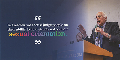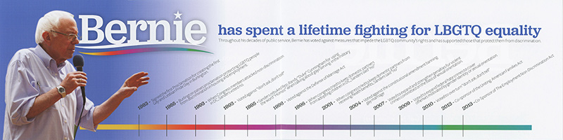"In America, we should judge people on their ability to do their job, not on their sexual orientation." Bernie has spent a lifetime fighting for LBGTQ equalityThroughout his decades of public service, Bernie has voted against measures that impede the LGBTQ community's rights and has supported those that protect them from discrimination.1983 - Signed the first Proclamation for creating the first Gay and Lesbian Pride Day in Burlington 1985 - Burlington passes proclamation protecting LGBTQ people from discrimination in housing and employment 1993 - When Congress members attacked non-discrimination in DC, Sanders voted no 1993 - Voted against "don't ask, don't tell" 1995 - Sanders rebuked Rep. Randy "Duke" Cunningham for using the word "Homos" when talking about gays serving in the military 1996 - Voted against the Defense of Marriage Act 1998 - When congress tried to keep domestic partners from adopting children in DC, Sanders said "no" 2001 - When congress tried to keep domestic partners from receiving health benefits, Sanders said "no" 2004 - Voted against the constitutional amendment banning gay marriage 2007 - Voted to expand and strengthen penalties for violent crimes committed on the basis of sexual orientation 2009 - Voted to expand federal hate crimes to cover offenses motivated by gender identity or sexual orientation 2010 - Voted to over turn "don't ask, don't tell" 2013 - Co-sponsor of the Uniting American Families Act 2013 - Co-Sponsor of The Employment Non-Discrimination Act |