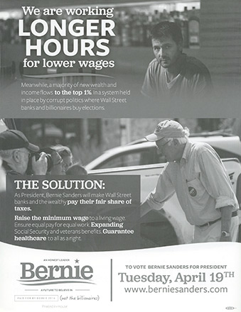 We are working LONGER HOURS for lower wagesMeanwhile, a majority of new wealth and income flows to the top 1%. In a system held in place by corrupt politics where Wall Street banks and billionaires buy elections.As President, Bernie Sanders will make Wall Street banks and the wealthy pay their fair share of taxes. Raise the minimum wage to a living wage. Ensure equal pay for equal work. Expanding Social Security and veterans benefits. Guarantee healthcare to all as a right. TO VOTE BERNIE SANDERS FOR PRESIDENT Tuesday, April 19th www.berniesanders.com |