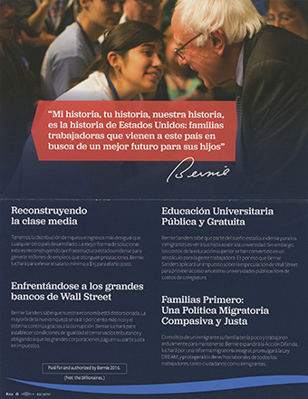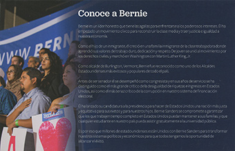 "Mi historia, tu historia, nuestra historia, es la historia de Estados Unidos: familias trabajadoras que vienen a este país en busca de un mejor futuro para sus hijos" Reconstruyendo la clase mediaTenemos la distribución de riqueza e ingresos más desigual que cualquier otro país desarrollado. La mejor forma de solucionar esto es reconstruyendo la infraestructura estadounidense para generar millones de empleos que otorguen prestaciones. Bernie luchará para elevar el salario mínimo a $15 para el año 2020.Enfrentándose a los grandes bancos de Wall StreetBernie Sanders sabe que nuestra economía está distorsionada. La mayoría de la nueva riqueza se va al 1 por ciento más rico y el sistema continúa gracias a la corrupción. Bernie luchará para establecer condiciones de igualdad al cerrar vacíos tributarios y obligando a que las grand es corporaciones paguen su parte justa en impuestos.Educación Universitaria Publica y GratuitaBernie Sanders sabe que parte del sueño estadounidense para los inmigrantes es ver a sus hijos asistir a la universidad. Sin embargo, los costos de la educación superior se han convertido en un obstáculo para la gente trabajadora. Es por eso que Bernie Sanders aplicará un impuesto sobre la especulación de Wall Street para proveer acceso a nuestras universidades públicas libre de costos de colegiatura.Familias Primero: Una Política Migratoria Compasiva y JustaComo hijo de un inmigrante su familia tenía poco y trabajaron arduamente para mantenerse. Bernie expandirá la Acción Diferida, luchará por una reforma migratoria integral, promulgará la Ley DREAM, y protegerá los derechos laborales de todos los trabajadores, tanto ciudadanos como inmigrantes.Paid for and authorized by Bernie 2016 (Not the billionaires.) [union bug] Conoce a BernieBernie es un líder honesto que tiene las agallas para enfrentarse a los poderosos intereses. Él ha empezado un movimiento cívico para reconstruir la clase media y traer justicia e igualdad a nuestra economía.Como el hijo de un inmigrante, él creció en una familia inmigrante de la clase trabajadora donde aprendió sus valores del trabajo duro, dedicación y respeto. De joven se unió al movimiento por los derechos civiles, y marchó en Washington con Martin Luther King, Jr. Como alcalde de Burlington, Vermont, Bernie fue reconocido como uno de los Alcaldes Estadounidenses más exitosos y populares de todo el país. Antes de ser senador él se desempeñó como congresista yen sus años de servicio se ha distinguido como el más grande crítico de la desigualdad de riquezas e ingresos en Estados Unidos, así como el más tenaz crítico de la corrupción en nuestro sistema de financiación electoral. Él ha lanzado su candidatura a la presidencia para hacer de Estados Unidos una nación más justa y equitativa para sus nietos y para nuestros hijos. Bernie Sanders se compromete a garantizar que los que trabajen tiempo completo en Estados Unidos puedan mantener a sus familias, y que cualquier estudiante en nuestro pa(s pueda asistir gratuitamente a la universidad pública. Es por eso que millones de estadounidenses están Unidos con Bernie Sanders para transformar nuestros sistemas políticos y económicos para que todos tengamos la oportunidad de alcanzar el éxito. |