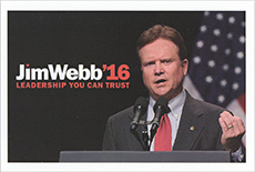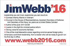 JimWebb'16Leadership you can trust, experience you can count on.• Combat infantry Marine in Vietnam • Counsel in the House of Representatives, Assistant Secretary of Defense and Secretary of the Navy, six years as a United States Senator • Author of the post- 9/11 GI Bill • Leader in the fight for criminal justice reform • Strong voice for economic fairness • One of the most listened-to voices regarding common-sense foreign policy Americans want fresh leadership, from a leader who will be ready to govern on his first day in office. www.webb2016.comPaid for by Jim Webb 2016 Printed In-Kind |