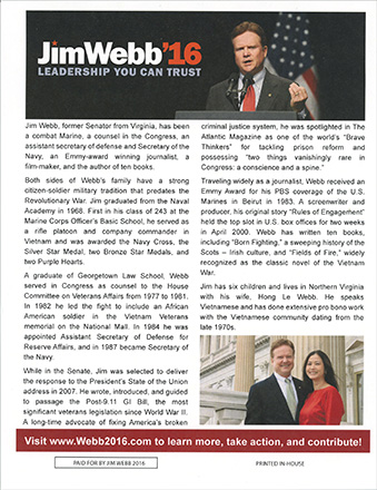 JimWebb'16LEADERSHIP YOU CAN TRUSTJim Webb, former Senator from Virginia, has been a combat Marine, a counsel in the Congress, an assistant secretary of defense and Secretary of the Navy, an Emmy-award winning journalist, a film-maker, and the author of ten books. Both sides of Webb's family have a strong citizen-soldier military tradition that predates the Revolutionary War. Jim graduated from the Naval Academy in 1968. First in his class of 243 at the Marine Corps Officer's Basic School, he served as a rifle platoon and company commander in Vietnam and was awarded the Navy Cross, the Silver Star Medal, two Bronze Star Medals, and two Purple Hearts. A graduate of Georgetown Law School, Webb served in Congress as counsel to the House Committee on Veterans Affairs from 1977 to 1981. In 1982 he led the fight to include an African American soldier in the Vietnam Veterans memorial on the National Mall. In 1984 he was appointed Assistant Secretary of Defense for Reserve Affairs, and in 1987 became Secretary of the Navy. While in the Senate, Jim was selected to deliver the response to the President's State of the Union address in 2007. He wrote, introduced, and guided to passage the Post-9.11 GI Bill, the most significant veterans legislation since World War II. A long-time advocate of fixing America's broken criminal justice system, he was spotlighted in The Atlantic Magazine as one of the world's "Brave Thinkers" for tackling prison reform and possessing "two things vanishingly rare in Congress: a conscience and a spine." Traveling widely as a journalist, Webb received an Emmy Award for his PBS coverage of the U.S. Marines in Beirut in 1983. A screenwriter and producer, his original story "Rules of Engagement" held the top slot in U.S. box offices for two weeks in April 2000. Webb has written ten books, including "Born Fighting," a sweeping history of the Scots - Irish culture, and "Fields of Fire," widely recognized as the classic novel of the Vietnam War. Jim has six children and lives in Northern Virginia with his wife, Hong Le Webb. He speaks Vietnamese and has done extensive pro bono work with the Vietnamese community dating from the late 1970s. Visit www.Webb2016.com to learn more, take action, and contribute! PAID FOR BY JIM WEBB 2016 PRINTED IN-HOUSE |
