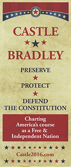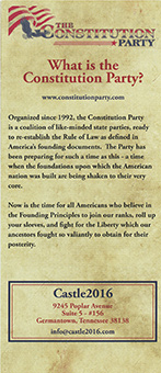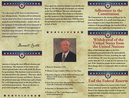 CONSTITUTION Charting America's course as a Free & Independent Nation Castle2016.com "lt is the nature of the State to seek dominance over the population. Freedom will not ultimately remain intact if we leave it unattended. America needs forward thinking leaders - leaders who do not apologize to the politically-correct demands of the thought police. Self-hatred and appeasement only foster more disrespect, We must find a way to chart our own course in the world as free and independent people" Darrell Castle America is facing the most difficult election year in its history. The response of the voters to the choices placed before them will decide the future for generations. This decision is just as crucial as that placed before the colonists. They were asked to choose between tyranny and liberty - between the political status quo of their time and a chance for a new beginning based on the idea of liberty and limited government. These the the keys to peace and tranquility in public life. Once again the American people must decide who they are. Are they people of principle, or cowards in the·face of Hillary? This year ethical people only have one choice. That choice is a Christian, pro-life, preserver of the Constitution and what most Conservatives say they want. Will they have the gumption to vote their conscience or fall back in lack of faith? • Born in Tennessee, USA • Marine Corps Combat Officer in Viet Nam. • Bachelor degrees in both Political Science and History from Eastern Tennessee State University • Juris Doctorate from Memphis State University (now the University of Memphis) • Attorney in Memphis since 1984. • Producer of The Castle Report podcast www.castlereport.us Adherence to the ConstitutionThe Constitution is the charter of liberty for the American Republic. It is much more than just a piece of paper or just a legal document. It is evidence of the grand design the founders left us and it secures the rights that God granted to us.Withdrawal of the United States from the United NationsMany of the inherent rights in the U.S Constitution are perceived to be superseded by the United Nat!ons Charter, including the right of self-defense. We must free ourselves from the notion that the U.N. is vital to U.S. interests. It is not. If the American people do not understand these things, then it is imperative that we educate them.End the Federal ReserveEnd the Federal Reserve's control of the United States' monetary system by repealing the Federal Reserve Act. Interest rates would no longer be tampered with, as lenders and borrowers would set their own rates.Agenda 21 - UNPrivate property rights are under assault in communities and rural areas across the nation as state and federal authorities move to enforce new planning development programs, particularly under the labels of Sustainable Development or Local Visioning. Darrell would withdraw the federal government from such international, sovereignty destroying legislation and begin the process of handing control of their lives and property back to the local peoplePro-Life StanceIf you've ever said that you will never vote for someone who is not pro-life, or who supports abortion, and if you are really serious about that statement, then you only have on choice in this election. Darrell is the only candidate of any party that is 100% pro-life or even close to it. He would veto funding for Planned Parenthood, confirm the validity of the 10th amendment, and convince Congress to take away Supreme Court jurisdiction over such matters.What is the Constitution Party?www.constitutionparty.comOrganized since,1992, the Constitution Party is a coalition of like-minded, state parties, ready to re-establish the Rule of Law as defined in America's founding documents. The Party has been preparing for such a time as this - a time when the foundations upon which the American nation was built are being shaken to their very core. Now is the time for all Americans who believe in the Founding Principles to join our ranks, roll up your sleeves, and fight for the Liberty which our ancestors fought so valiantly to obtain for their posterity. Castle2016 9245 Poplar Avenue Suite 5 - #156 Germantown, Tennessee info@castle2016.com |