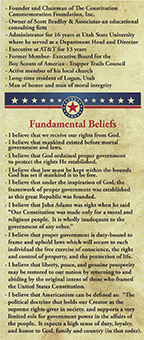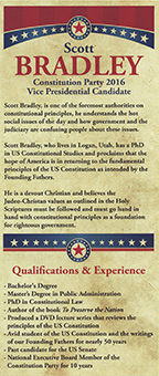 Scott Bradley Constitution Party 2016 Vice Presidential Candidate Scott Bradley, is one of the foremost authorities on constitutional principles, he understands the hot social issues of the day and how government and the judiciary are confusing people about these issues. Scott Bradley, who lives in Logan, Utah, has a PhD in US Constitutional Studies and proclaims that the hope of America is in returning to.the fundamental principles of the US Constitution as intended by the Founding Fathers. He is a devout Christian and believes the Judeo-Christan values as outlined in the Holy Scriptures must be followed and must go hand in hand with constitutional principles as a foundation for righteous government. Qualifications & Experience• Bachelor's Degree• Master's Degree in Public Administration • PhD in Constitutional Law • Author of the book To Preserve the Nation • Produced a DVD lecture series that reviews the principles of the US Constitution • Avid student of the US Constitution and the writings of our Founding Fathers for nearly 50 years • Past candidate for the US Senate • National Executive Board Member of the Constitution Party for 10 years • Founder arid Chairman of The Constitution Commemoration Foundation, Inc. • Owner of Scott Bradley & Associates-an educational consulting firm • Administrator for 16 years at Utah State University where he served as a Department Head and Director • Executive at AT&T for 13 years • Former Member- Executive Board for the Boy Scouts of America - Trapper Trails Council • Active member of his local church • Long-time resident of Logan, Utah • Man of honor and man of moral integrity Fundamental Beliefs• I believe that we receive our rights from God.• I believe that mankind existed before mortal government and laws. • I believe that God ordained proper government to protect the rights He established. • I believe that law must be kept within the bounds God has set if mankind is to be free. • I believe that under the inspiration of God, the framework of proper government was established as this great Republic was founded. • I believe that John Adams was right when he said "Our Constitution was made only for a moral and religious people. It is wholly inadequate to the government of any other." • I believe that proper government is duty-bound to frame and uphold laws. which will secure to each individual the free exercise of conscience, the right and control of property, and the protection of life. • I believe that liberty, peace, and genuine prosperity may be restored to our nation by returning to and abiding by the original intent of those who framed the United States Constitution. • I believe that Americanism can be defined as: "The political doctrine that holds our Creator as the supreme rights-giver in society, and supports a very limited role for government power in the affairs of the people. It expects a high sense of duty, loyalty, and honor to God, family and country (in that order). |