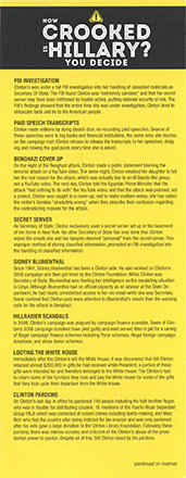 x 11 1/2", Fall 2016. HOW CROOKED IS HILLARY?YOU DECIDEFBI INVESTIGATIONClinton's was under a full FBI investigation into her handling of classified materials as Secretary Of State. The FBI found Clinton was "extremely careless" and that her secret server may have been infiltrated by hostile actors, putting national security at risk. The FBl's findings showed that the entire time she was under investigation, Clinton tried to obfuscate facts and lie to the American people. PAID SPEECH TRANSCRIPTS Clinton made millions by doing closed-door, no-recording paid speeches. Several of these speeches were to big banks and financial institutions, the same ones she decries on the campaign trail. Clinton refuses to release the transcripts to her speeches, dodging and moving the goal posts every time she is asked. BENGHAZI COVER UP On the night of the Benghazi attack, Clinton made a public statement blaming the terrorist attack on a You Tube video. The same night, Clinton emailed her daughter to tell her the real reason for the attack, which was actually due to an Al Qaeda-like group, not a You Tube video. The next day, Clinton told the Egyptian Prime Minister that the attack "had nothing to do with" the You Tube video, and that the attack was planned, not a protest. Clinton was caught in a cover-up, and to make matters worse, she has called the victim's families "absolutely wrong" when they describe their confusion regarding the contradicting reasons for the attack. SECRET SERVER As Secretary of State, Clinton exclusively used a secret server set up in the basement of her home in New York. No other Secretary of State has ever done this. Clinton wiped the emails she and her lawyers deemed "personal" from the secret server. This improper method of storing classified information, prompted an FBI investigation into the handling of classified information. SIDNEY BLUMENTHAL Since 1997, Sidney Blumenthal has been a Clinton aide. He also worked on Clinton's 2008 campaign and then got hired by the Clinton Foundation. While Clinton was Secretary of State, Blumenthal was feeding her intelligence on the escalating situation in Libya. Although Blumenthal had no official capacity as an advisor at the State Department, he had nearly unrestricted access to her via email while she was Secretary. Some contend that Clinton paid more attention to Blumenthal's emails than the warning calls for the attack in Benghazi. HILLRAISER SCANDALS In 2008, Clinton's campaign was plagued by campaign finance scandals. Some of Clinton's 2008 campaign bundlers have pied guilty and even served time in jail for a variety of illegal campaign finance schemes including Ponzi schemes, illegal foreign campaign donations, and straw donor schemes. LOOTING THE WHITE HOUSE Immediately after the Clinton's left the White House, it was discovered that Bill Clinton retained almost $200,000 in gifts he had received while President, a portion of those gifts were intended for and therefore belonged to the White House. The Clinton's had to return some of the furniture they took and pay the White House for some of the gifts that they took upon their departure from the White House. CLINTON PARDONS On Clinton's last day in office he pardoned 140 people including his half-brother Roger, who was in trouble for distributing cocaine, 16 members of the Puerto Rican Separatist Group FALN which was convicted of violent crimes including bomb-making, and Marc Rich who fled the country after being indicted for tax evasion and was only pardoned after his wife gave a large donation to the Clinton Library Foundation. Following these pardons, there was intense scrutiny and criticism of the Clinton's abuse of the presidential power to pardon. Despite all of this, Bill Clinton stood by his pardons. (continued