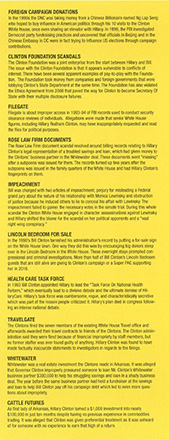 In the 1990s the DNC was taking money from a Chinese Billionaire named Ng Lap Seng who hoped to buy influence in American politics through his 10 visits to the Clinton White House, once even sharing an elevator with Hillary. In 1996, the FBI investigated Democrat party fundraising practices and uncovered that officials in Beijing and in the Chinese Embassy in DC were in fact trying to influence US elections through campaign contributions. CLINTON FOUNDATION SCANDALS The Clinton Foundation was a joint enterprise from the start between Hillary and Bill. The issue with the Clinton Foundation is that it appears vulnerable to conflicts of interest. There have been several apparent examples of pay-to-play with the Foundation. The Foundation took money from companies and foreign governments that were lobbying Clinton's State Department at the same time. The Foundation has also violated the Ethics Agreement from 2008 that paved the way for Clinton to become Secretary Of State with their multiple disclosure failures. FILEGATE Filegate is about improper access in 1993-94 of FBI records used to conduct security clearance reviews of individuals. Allegations were made that senior White House figures, including Hillary Rodham Clinton, may have inappropriately requested and read the files for political purposes. ROSE LAW FIRM DOCUMENTS The Rose Law Firm document scandal revolved around billing records relating to Hillary Clinton's legal representation of a troubled savings and loan, which had given money to the Clintons' business partner in the Whitewater deal. These documents went "missing" after a subpoena was issued for them. The records turned up two years after the subpoena was issued in the family quarters of the White House and had Hillary Clinton's fingerprints on them. IMPEACHMENT Bill was charged with two articles of impeachment; perjury for misleading a Federal grand jury about the nature of his relationship with Monica Lewinsky and obstruction of justice because he induced others to lie to conceal his affair with Lewinsky. The impeachment failed to garner the necessary votes in the senate trial. During this whole scandal the Clinton White House engaged in character assassinations against Lewinsky and Hillary shifted the blame for the scandal on her political opponents and a "vast right wing conspiracy." LINCOLN BEDROOM FOR SALE In the 1990's Bill Clinton tarnished his administration's record by putting a for-sale sign on the White House lawn. One way they did this was by encouraging big donors sleep over in the Lincoln Bedroom in the White House. These overnight stays prompted congressional and criminal investigations. More than half of Bill Clinton's Lincoln Bedroom guests that are still alive are giving to Clinton's campaign or a Super PAC supporting her in 2016. HEALTH CARE TASK FORCE In 1993 Bill Clinton appointed Hillary to lead the "Task Force On National Health Reform," which eventually lead to a divisive debate and the ultimate demise of HillaryCare. Hillary's task force was cumbersome, rogue, and characteristically secretive which was part of the reason people criticized it. Hillary's plan died in congress following an intense national debate. TRAVELGATE The Clintons fired the seven members of the existing White House Travel office and afterwards awarded their travel contracts to friends of the Clintons. The Clinton administration said they were fired because of financial impropriety by staff members, but no former staffer was ever found guilty of anything. Hillary Clinton was found to have made factually inaccurate statements to investigators in regards to the firings. WHITEWATER Whitewater was a real estate investment the Clintons made in Arkansas. It was alleged that Governor Clinton improperly pressured someone to loan Mr. Clinton's Whitewater business partner $300,000 to help his struggling savings and loan in a shady business deal. The year before the same business partner had held a fund raiser at the savings and loan to help Bill Clinton pay off his campaign debt which led to even more questions about impropriety. CATTLE FUTURES As first lady of Arkansas, Hillary Clinton turned a $1,000 investment into nearly $100,000 in just ten months despite having no previous experience in commodities trading. It was alleged that Clinton was given preferential treatment as it was unheard of for someone with no experience to earn that high of a return. |