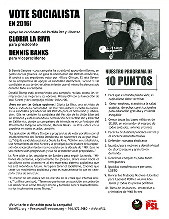 VOTE SOCIALIST IN 2016! Support Peace & Freedom Party candidates GLORIA LA RIVA for President DENNIS BANKS for Vice President If Bernie Sanders–whose campaign has drawn the support of millions, especially young people–doesn't win the Democratic Party nomination, he will urge his supporters to vote for Hillary Clinton. He is carrying through his pledge to support the Democratic nominee, even if that nominee is part of the same establishment his whole campaign has denounced. Donald Trump is running a racist, anti-immigrant, anti-women and anti-worker campaign. Hillary Clinton is the choice of Wall Street and the Military-Industrial Complex. But they are not the only choices! Gloria La Riva, a lifelong labor, anti-war and community activist, is the presidential candidate of the Party for Socialism and Liberation. She is also the candidate of the Liberty Union Party in Vermont and is seeking the Peace and Freedom Party nomination in California, where her running mate is American Indian Movement co-founder, Dennis Banks. La Riva will be on the ballot in other states, too. "Hillary Clinton's appeal for progressives to vote for her and the Democratic Party establishment in November is highly insulting," said socialist candidate Gloria La Riva. "Clinton is a warmonger, a tool of Wall Street and was a key backer of expanding racist mass incarceration in the 1990s. These are not progressive credentials, and she does not deserve progressive votes." La Riva is calling on Sanders supporters to keep fighting. "Millions of people, especially young people, now look to socialism as an alternative to the hopeless capitalist system that is robbing them of a future. But to have socialism, we need to have a socialist movement and that's what my campaign is all about building. "The lesser-of-two-evils has gotten us into the crisis we're in now," La Riva concluded, "We need to take a stand against corporate Democrats like Hillary Clinton as well bigoted billionaires like Trump." Volunteer or Donate to the campaign! VotePSL.org • PeaceAndFreedom.org 916.572.9680 • @VotePSL OUR 10 POINT PROGRAM 1. For the earth to live, capitalism must end 2. Make a job, free health care, free education & affordable housing Constitutional rights 3. Shut down all U.S. military bases around the world-bring all the troops, planes and ships home 4. Stop racist police brutality and mass incarceration 5. Defend our unions 6. Equality for women and free, safe, legal abortion on demand 7. Full rights for all immigrants 8. Full federal equality for LGBTQ people 9. Honor Native Treaties-Free Leonard Peltier 10. Seize the banks–Jail Wall Street criminals VOTE SOCIALISTA EN 2016! Apoye los candidatos del Partido Paz y Libertad GLORIA LA RIVA para presidente DENNIS BANKS para vicepresidente Si Bernie Sanders-cuya campaña ha atraído el apoyo de millones, en particular los jóvenes-no gana la nominación del Partido Demócrata, él pedirá a sus seguidores votar por Hillary Clinton. El está llevando su compromiso de apoyar al candidato demócrata, incluso si tal candidato es parte del establecimiento que el mísmo ha denunciado durante toda su campaña. Donald Trump está promoviendo una campaña racista contra los inmigrantes, las mujeres y los obreros. Hillary Clinton es la elección de Wall Street y del complejo militar-industrial. ¡Pero no son las únicas opciones! Gloria La Riva, una activista de toda su vida de la comunidad, de los trabajadores y contra la guerra, es la candidata presidencial del Partido para el Socialismo y Liberación. Ella es también la candidata del Partido de la Unión Libertad en Vermont y está buscando la nominación del Partido Paz y Libertad en California, donde su compañero de fórmula es el ce-fundador del Movimiento Indígena Americano, Dennis Banks. La Riva estará en la papeleta en otros estados también. "La apelación de Hillary Clinton a progresistas de votar por ella y por el establecimiento del Partido Demócrata en noviembre es un gran insulto," dijo la candidata socialista Gloria La Riva. "Clinton es una belicista, una herramienta de Wall Street y la principal patrocinadora de la expansión del encarcelamiento masivo racista en la década de 1990. Esas no son credenciales progresistas y ella no se merece votos progresistas." La Riva pide a los seguidores de Sanders para seguir luchando. "Millones de personas, especialmente los jóvenes, ahora miran hacia el socialismo como alternativa al sin-esperanza sistema capitalista que les está robando su futuro. Pero para tener el socialismo, tenemos que tener un movimiento socialista y eso es exactamente lo que mi campaña trata de construir. "El menor de dos males nos ha metido en la crisis que estamos ahora," La Riva concluyó, "Tenemos que tomar una posición en contra de los demócratas como Hillary Clinton y también contra los multimillonarios intolerantes como Trump." ¡Voluntario o donación para la campaña! VotePSL.org • PeaceAndFreedom.org • 916.572. 9680 • @VotePSL |