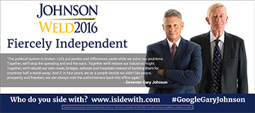 Fiercely Independent"The political system is broken. Let's put parties and differences aside while we solve our problems. Together we'll stop the spending and end the wars. Together we'll restore our industrial might. Together, we'll rebuild our own roads, bridges, schools and hospitals instead of building them for countries half a world away. And if, in four years, we as a people decide we didn't like peace, prosperity and freedom, we can always vot the authoritarians back into office again."- Governor Gary Johnson Who do you side with?