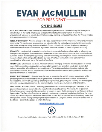 ON THE ISSUESNATIONAL SECURITY - A free America requires the strongest and most capable military and intelligence infrastructure in the world. The bravery and commitment of our men and women in uniform is unquestioned; we need to provide them the technology, training, and support to defeat the threats of today and secure our nation in the future.JOBS & THE ECONOMY - America should be the best place in the world for innovation, entrepreneurship and opportunity. We must reform a system that too often benefits the politically connected and the corporate elite, while leaving too many Americans behind. Our tax code should be lean, simple and encourage investment here at home. Government regulations should be reduced to foster a dynamic economy. EDUCATION - Local control, expanded opportunity and a return to fundamentals are vital to reforming our failing education system. The markets and economies of the future will require more than one-size-fits-all curricula, and we must expand opportunity for every student by providing more options for the charter and magnet schools which bring out the best in our kids. We should eliminate Federal Common Core mandates that take power out of the hands of teachers. HEALTH CARE - Obamacare has failed American families, driving up costs and reducing access to far too many. With competition, deregulation and innovation we can build a modern health care system that delivers accessible, affordable and high-quality care. Vulnerable populations, including patients with preexisting conditions, should be protected. Real healthcare reform means putting patients, families, and doctors at the heart of health care. ENERGY & ENVIRONMENT - America is on the road to becoming the world's energy superpower, while protecting our natural resources for future generations. We are blessed with a unique abundance of resources that provide an opportunity for energy independence, prosperity and security. We must expand domestic energy production across the board, including natural gas, oil, nuclear, and renewables. GOVERNMENT ACCOUNTABILITY - A healthy government is accountable to its people. Too much of the power in Washington is centered too far away from the lives of everyday Americans. An all-powerful federal government has eroded the separation of powers in a way that is corrosive to our Republic and our Constitution. The Executive Branch now routinely creates major rules and regulations that have the force of law, adjudicates disputes, and issues fines-all on its own. Article I of the Constitution clearly states that all legislative powers belong to the people's representatives in Congress. Power should be shifted back to the States - closer to the people to whom it belongs. www.EvanMcMullin.com Prepared and paid for by the Independence Party of Minnesota, PO Box 40495, St. Paul, MN 55104 |