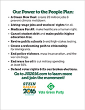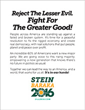 Lesser Evil. Fight For The Greater Good! People across America are standing up against a failed and broken system. It's time for a peaceful revolution to fix the rigged economy and create real democracy, with real solutions that put people, planet and peace over profit. An incredible 60% of Americans want a new major party. We are giving voice to this rising majority, empowering a new generation that knows there's no future in politics as usual. Together we can lead the way to an America, and a world, that works for us all. It's in our hands! Our Power to the People Plan: A Green New Deal: create 20 million jobs & prevent climate meltdown. Living-wage jobs and workers' rights for all. Medicare For All: make healthcare a human right. Cancel student debt and make public higher education free. Revive public schools & end high-stakes testing. Create a welcoming path to citizenship for immigrants. End police violence, mass incarceration, and the war on drugs. End wars for oil & cut military spending at least 50%. Defend voter rights & fix our broken elections. Go to Jill2016.com to learn more and join the movement! |