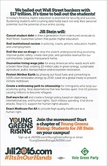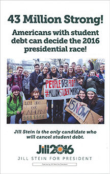43 Million Strong!Americans with student debt can decide the 2016 presidential race!Jill Stein is the only candidate who will cancel student debt.We bailed out Wall Street bankers with $17 trillion. It's time to bail out the students!In today's America, higher education is essential for security and success. Burdening students with crushing debt holds back not only their personal potential, but the potential of our entire society.Jill Stein will:Cancel student debt to free a generation from indentured servitude to Wall Street. Guarantee tuition-free public higher education.End institutional racism in policing, courts, prisons, education, health, and unemployment. End the war on drugs to stop the violent underground drug economy, improve public safety, create new jobs, and generate revenue for our communities. Legalize marijuana & hemp. Guarantee living wage jobs for every American who needs work with a Green New Deal, creating 20 million jobs in green energy, sustainable agriculture, public transportation and ecosystem restoration. Protect Mother Earth by phasing out fossil fuels and converting to 100% clean renewable energy by 2030. Lead on a global treaty to prevent climate meltdown. Create a welcoming path to citizenship for immigrants who keep our economy going. Stop deportations that tear families apart. End US policies causing millions to become refugees. End wars for oil and create a foreign policy based on diplomacy, international law, and human rights. Slash military spending. End drone attacks. Stop U.S. support for human rights abusers. Enact Medicare For All to provide high quality healthcare as a human right. Join the movement! Start a chapter of Young Greens Rising: Students for Jill Stein on your campus! Sign up at Jill2016.com/YoungGreensRising or email YoungGreensRising@Jill2016.com. |