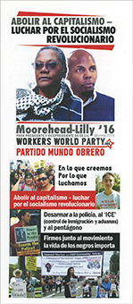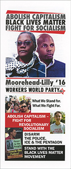ABOLISH CAPITALISM BLACK LIVES MATTER FIGHT FOR SOCIALISM Moorehead-Lilly '16 WORKERS WORLD PARTY What We Stand for What We Fight for. ABOLISH CAPITALISM - FIGHT FOR REVOLUTIONARY SOCIALISM DISARM THE POLICE, ICE & THE PENTAGON STAND WITH THE BLACK LIVES MATTER MOVEMENT 10 POINT ELECTION PROGRAM1. End the war on Black people. Reparations now. Stand with and defend the Black Lives Matter Movement.We stand in solidarity with and support the demands of the Black Lives Matter uprising, including jailing killer cops, abolishing the police and the historic necessity of reparations for Black people here and worldwide. Black, Brown and Indigenous peoples have the right to fight racist oppression by any means necessary. The rebellions in Baltimore and Ferguson were righteous acts of indignation and should be defended by the working-class movement. 2. End racism. Support self-determination for Black, Latino/a, Indigenous, Asian and Arab peoples. The U.S. has a long history of violating the rights of the oppressed. The southwest part of this country was stolen from Mexico, creating an internal colony of Mexican/Chicano people. Genocide and robbery of the lands of Native people are part and parcel of the brutal history of the U.S. Japanese Americans experienced criminal internment camps, and Filipinos in the U.S. suffer tremendous exploitation here and in their homeland. Chinese people were made indentured servants to build this country's railroads. And Puerto Rico and Hawaii were overthrown and lost their sovereignty. 3. Abollsh capitalism - fight for a socialist revolution. Capitalism cannot be reformed. We need revolutionary socialism -a system of people's power, where the workers and oppressed peoples, not the banks and corporations, own and control everything, where the needs of the 99% are filled, not profit for the 1%. Although progressive changes should be supported, they do not go far enough; the whole rotten system must be overturned. With the profit drive eliminated and the power in the hands of the masses of people who create society's wealth, great advances are possible. Everyone can have a job at a living wage or guaranteed income for those who can't work. Everyone can have free, quality health care, free, quality education through college, affordable housing, and the infrastructure can be repaired. All the ills created by capitalism can finally begin to be dismantled once human needs, not corporate greed, are society's central organizing principle. 4. Stop the deportations and raids. Full rights for all migrants. End lslamophobla. Open the borders for people; close the borders for profiteers and warmongers. No worker is illegal, whether they are from Mexico, Honduras, Syria, Haiti or anywhere. What must be illegal is the role of U.S. corporations and the military in provoking instability and imposing misery, causing people from those countries to seek refuge. No racist attacks on immigrants and Muslims. Every migrant should be accorded full civil and human rights. Shut down U.S. Immigration and Customs Enforcement. Instead of building walls on the U.S./Mexican border, open the borders for free and safe travel. Stop the so-called drug war that creates horrific conditions of incarceration and violence and fills the bankers' coffers. 5. Food, water, housing, clothing, health care, education and childcare for all. Solidarity with homeless people. Moratorium NOW! to stop all foreclosures, evictions, utlllty shut-offs. Justice for the people of Fllnt, Mich. Free education for all, full funding for publlc schools. Job training with a stipend. Cancel student debt. Defend the right of student athletes to strike for a living wage. No one in the world's wealthiest country should be hungry. Restore and expand all food programs. Free, clean water is a human right. Capitalist housing creates wealthy landlords and gentrification, a new form of colonialism. We want permanent, quality, affordable housing for all. Abolish health-care-for-profit and replace it with a publicly owned health care system with free medical and dental care. Jail the pharmaceutical profiteers. Quality public education is being systematically eliminated via forced testing, Common Core and charter schools. Young people, especially youth of color, are denied education and sent to prison in ever increasing numbers. College should be free. Student debt, the trillions of dollars the federal government and banks are robbing from millions of workers, should be immediately cancelled. 6. Women need full liberation in all facets of society. Equal pay for comparable work. Reproductive justice,including the right to abortion. Restore all welfare programs. Lesbian, gay, bisexual, trans*, queer liberation now. Stop the murders of trans women. Full rights for all queer people. We demand equal pay for equivalent work. Women's control of their own bodies requires full reproductive rights: free, legal, accessible abortion, birth control, no forced sterilization and full support needed to raise healthy children. Abuse, rape, incest and violence must end. Fully funded safe houses are needed. Stop the objectification and commodification of women. Federal law banning arti-LGBTQ discrimination is urgent. End the murders of transgender women of color; support the calls for LGBTQ people to leave the military and for LGBTQ communities fighting displacement and gentrification. Demand access to employment and health care that is sensitive to LGBTQ people; resources devoted to eliminating LGBTQ youth homelessness; and the right of all LGBTQ people to define their families. We support LGBTQ people in the fight for self-determination, trans and gender liberation, and against co-optation of LGBTQ issues such as "pinkwashing" by Israel. 7. Change the system, not the cllmate. Make the Pentagon and oll corporations pay for the destruction of the planet. Reparations for cllmate victims of Hurricane Katrina and elsewhere. Immediate support for cllmate refugees. Fr