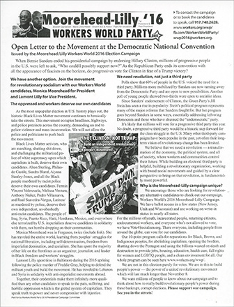 '16 Abolish Capitalism - Black Lives Matter - Fight for Socialism @wwp2016 WORKERS WORLD PARTY.org To contact the campaign or to book the candidates to speak, call 917.740.2628. www.workers.org/wwp/ fb.com/WorkersWorldParty/ wwp2016@workers.org. Open Letter to the Movement at the Democratic National Convention Issued by the Moorehead/Lilly Workers World 2016 Election Campaign When Bernie Sanders ended his presidential campaign by endorsing Hillary Clinton, millions of progressive people in the U.S. were left to ask, "Who could I possibly support now?" As the Republican Party ends its convention with all the appearance of fascism on the horizon, do progressives vote for Clinton in fear of a Trump victory? We have another option. Join the movement for revolutionary socialism with our Workers World candidates, Monica Moorehead for President and Lamont Lilly for Vice President. The oppressed and workers deserve our own candidates As the most unpopular election in U.S. history plays out, the historic Black Lives Matter movement continues to heroically take the streets. This movement occupies headlines, highways, and police precincts across the country, demanding an end to police violence and mass incarceration. We will not allow the police and politicians to push back the movement. Black Lives Matter activists, who are marching, shutting shit down, and challenging the militarized police of white supremacy upon which capitalism is built, deserve their own candidates. Alton Sterling, Philando Castile, Sandra Bland, Aiyana Stanley-Jones, and all the Black people murdered by racist police deserve their own candidates. Fennin Vincent Valenzuela, Melissa Ventura, Anthony Nufiez, Pedro Villanueva, and Raul Saavedra-Vargas, Latinos/as murdered by police, deserve their own independent, un-abashedly anti-racist candidates. The people of Iraq, Syria, Puerto Rico, Haiti, Honduras, Mexico, and everywhere else terrorized by U.S. imperialism deserve candidates in solidarity with them, not bombs dropping on their communities. Monica Moorehead was in Ferguson, twice (include link). She has traveled the entire world, learning from peoples' struggles for national liberation, including self-determination, freedom from imperialist domination, and socialism. She has spent the majority of her life on the :frontlines as an organizer, journalist, and leader in Black freedom and workers' struggles. Lamont Lilly spent time in Baltimore during the 2015 uprising following the police murder of Freddie Gray, helping to defend the militant youth and build the movement. He has traveled to Lebanon and Syria in solidarity with anti-imperialist movements abroad. Together, their credentials make them infinitely more qualified than any other candidates to speak to the pain, suffering, and horrific oppression which is the global system of capitalism. They speak truth to power and never compromise with injustice. We need revolution, not just a third party Polls show that 60% of people in the U.S. voiced the need for a third party. Millions more mobilized by Sanders are now turning away from the Democratic Party and are open to new possibilities. Another poll of young people showed two-thirds were open to socialist ideas. Since Sanders' endorsement of Clinton, the Green Party's Jill Stein has seen a rise in popularity. Stein's political program represents many of the major reforns that Sanders fought for. But her program goes beyond Sanders in some ways, essentially addressing left-wing Democrats and those who have shunned the "undemocratic" party. It's likely that millions will vote for a progressive third party this year. No doubt, a progressive third party would be a historic step forward for the class struggle in the U.S. Many other third-party campaigns have been popular in the past, yet often their longterm vision of revolutionary change has been limited. We believe that we need a revolution - a transformation of the economy, the political system, and all of society, where workers and communities control their future. While building an electoral third party is helpful, building a revolutionary organization, working with broad social movements and guided by a clear perspective to bring on that revolution, is fundamentally more powerful. Why is the Moorehead-Lilly campaign unique? We encourage those who are looking for revolutionary alternative candidates to check out our campaign, Workers World's 2016 Moorehead-Lilly Campaign. We have ballot access in a few states (New Jersey, Utah and Wisconsin) and are working on write-in status in nearly all states. For the millions of.youth, incarcerated people, returning citizens, undocumented workers, and everyone who's not allowed to vote, we have Vote4Socialism.org. There everyone, including people from around the globe, can vote for our candidates. Our 10-point program calls for reparations for Black, Brown, and Indigenous peoples, for abolishing capitalism, opening the borders, shutting down the Pentagon and using the billions wasted on death and destruction to provide jobs, housing, education, health care, full rights for women and LGBTQ people, and a clean environment for all. Our whole program can be seen here www.workers.org/wwp/. We are not in this election purely for votes. We are in this to build people's power - the power of a united revolutionary movement which will last much longer than November 8. We want millions of people to know about our campaign and to think about how to really build revolutionary people's power during these bankrupt, corrupt elections. Please support our campaign. See you in the streets! |